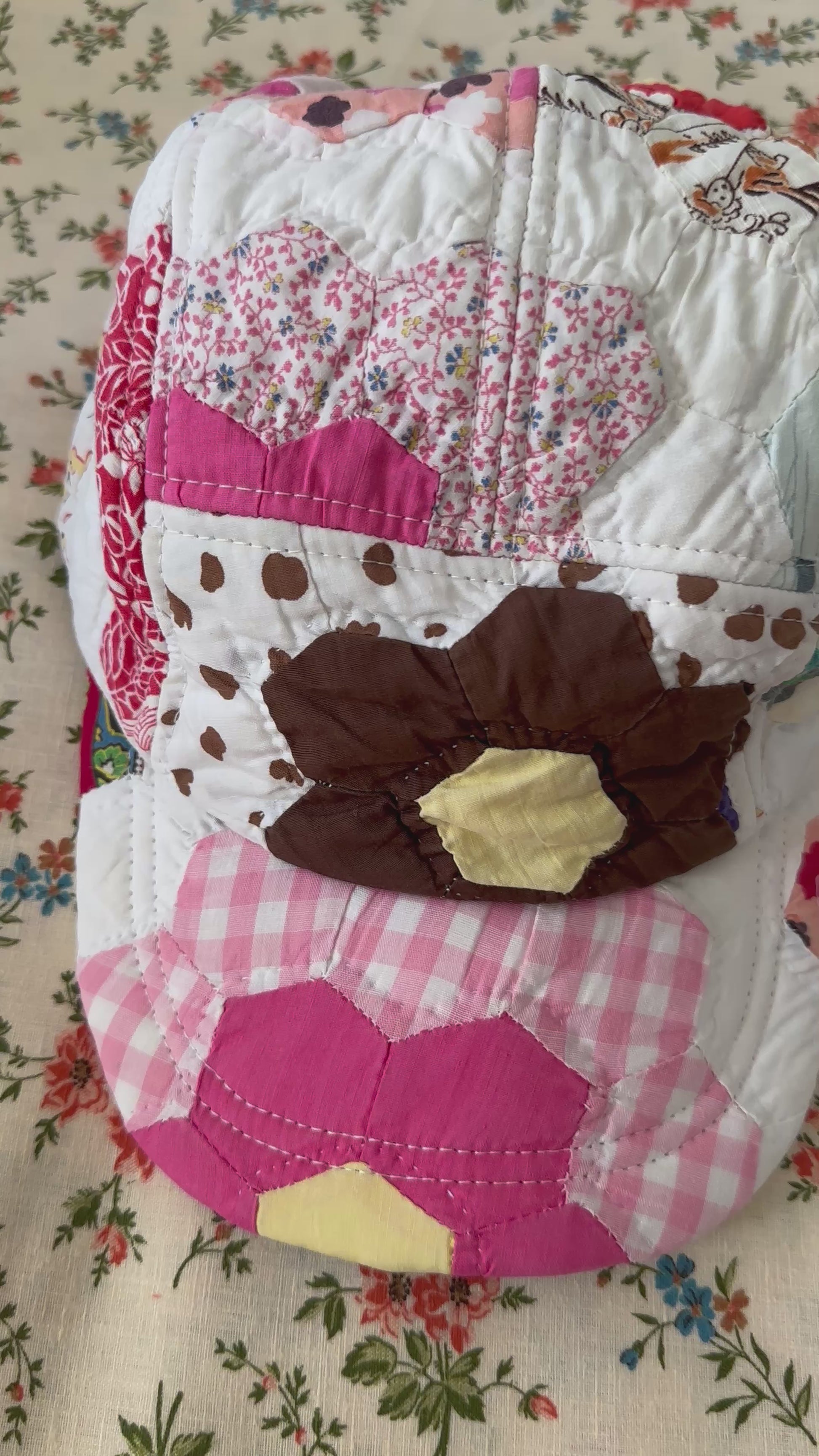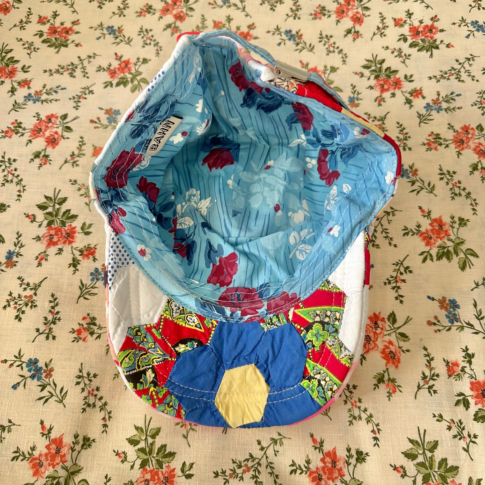 This classic 5-panel hat is upcycled from hand-stitched vintage cotton quilt in Grandmother's Flower Garden pattern. Lined with vintage repro cotton print. Adjustable metal buckle closure.