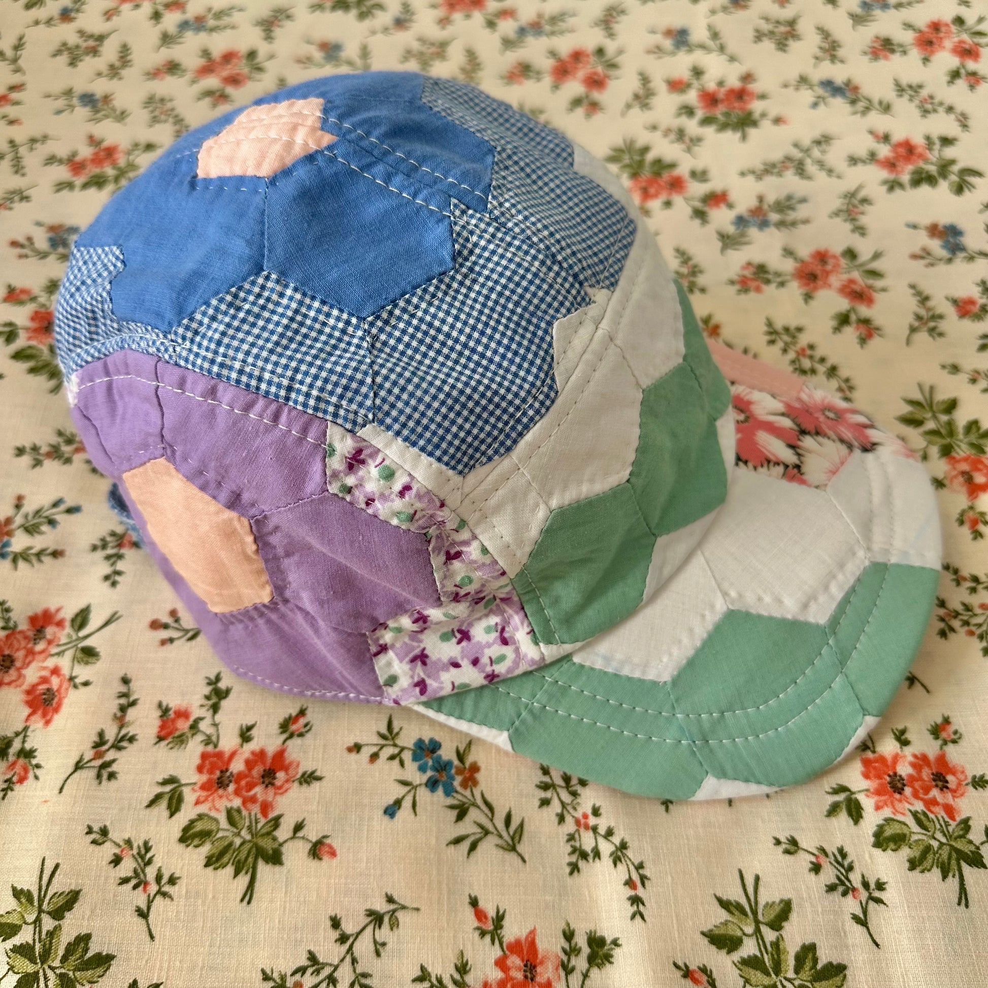 This classic 5-panel hat is upcycled from hand-stitched vintage cotton quilt in Grandmother's Flower Garden pattern. Lined with vintage repro cotton print. Adjustable metal buckle closure.