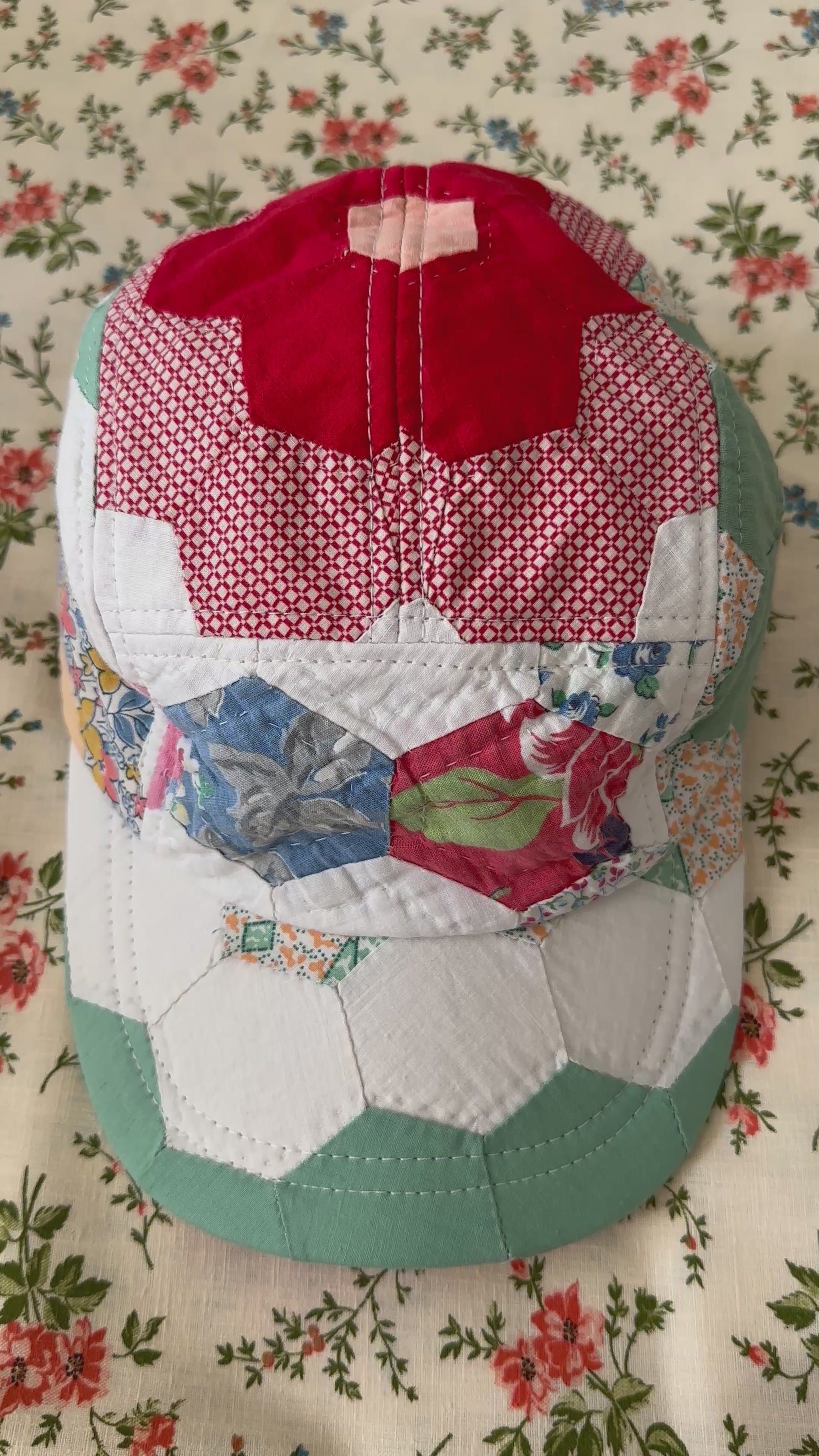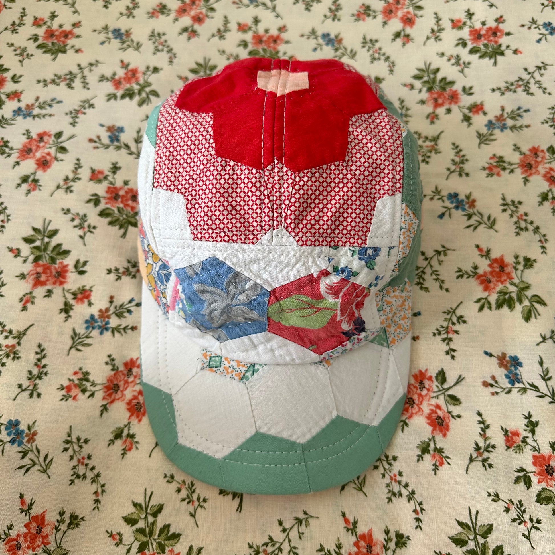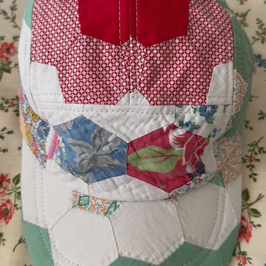 This classic 5-panel hat is made from upcycled hand-stitched vintage cotton quilt in Grandmother's Flower Garden pattern. Lined with vintage repro cotton print. Adjustable metal buckle closure.