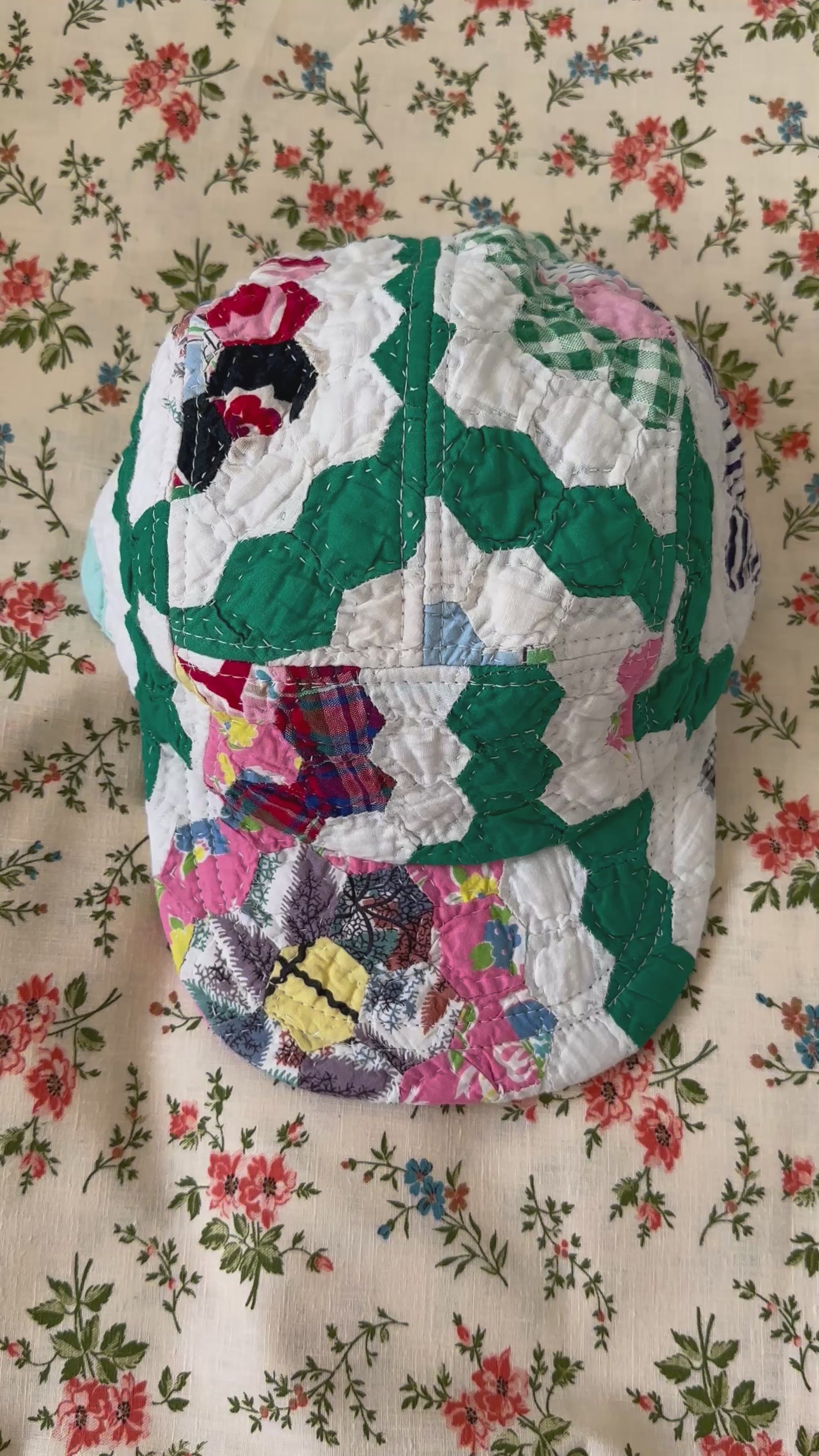 This classic 5-panel hat is upcycled fromhand-stitched vintage cotton quilt in Grandmother's Flower Garden pattern. Lined with vintage repro cotton print. Adjustable metal buckle closure.