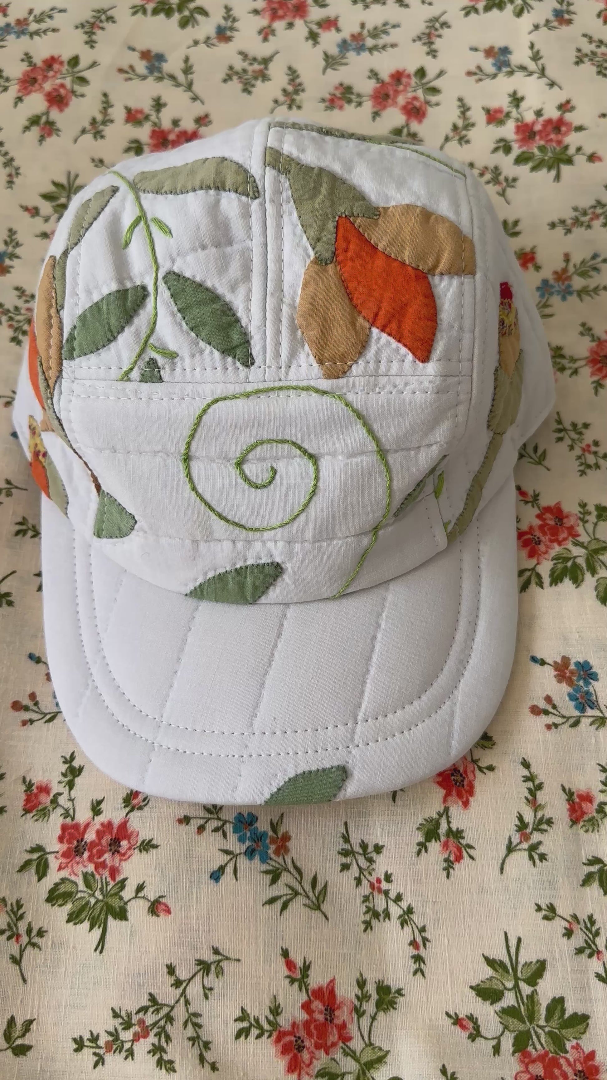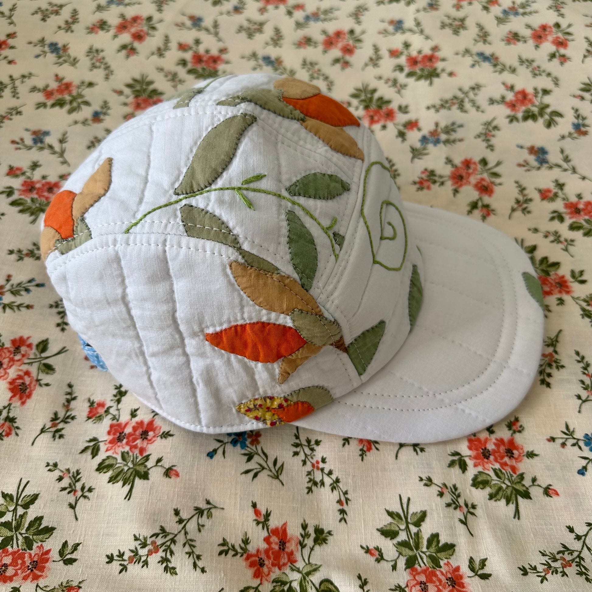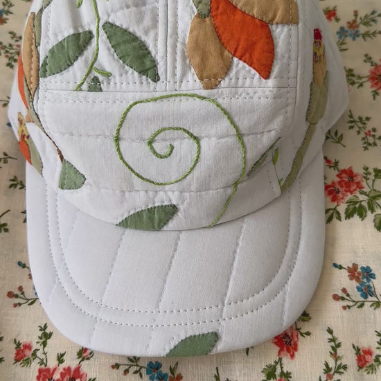 This classic 5-panel hat is upcycled from hand-stitched floral appliquéd vintage cotton quilt. Lined with vintage repro cotton print. Adjustable metal buckle closure.