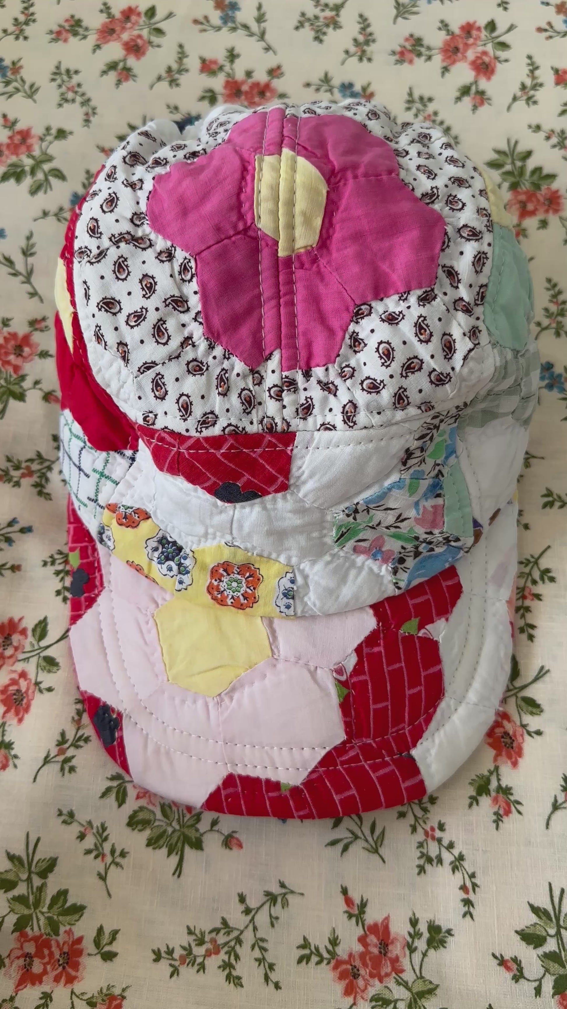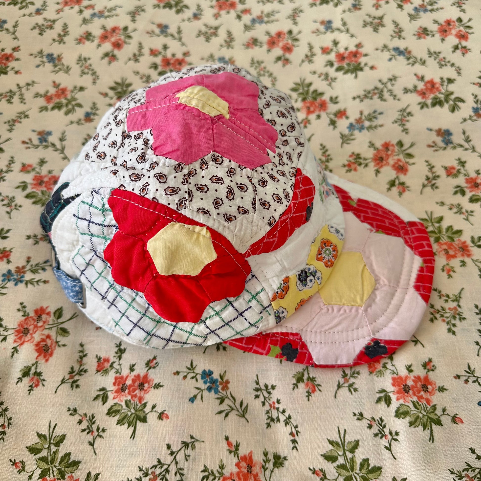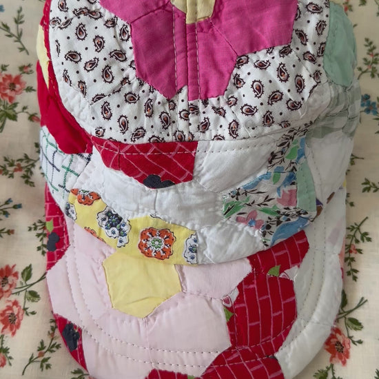 This classic 5-panel hat is upcycled from hand-stitched vintage cotton quilt in Grandmother's Flower Garden pattern. Lined with vintage repro cotton print. Adjustable metal buckle closure.