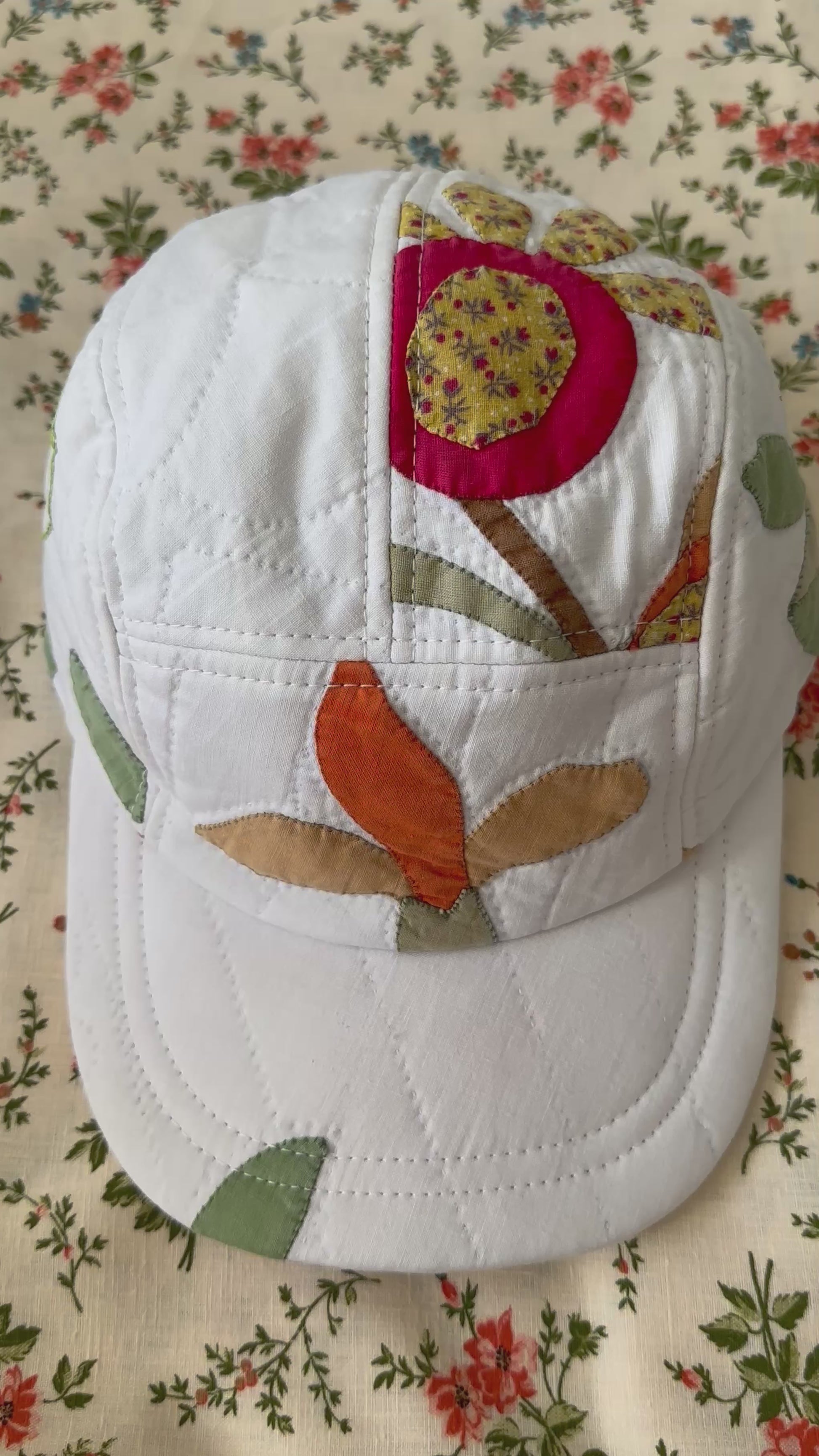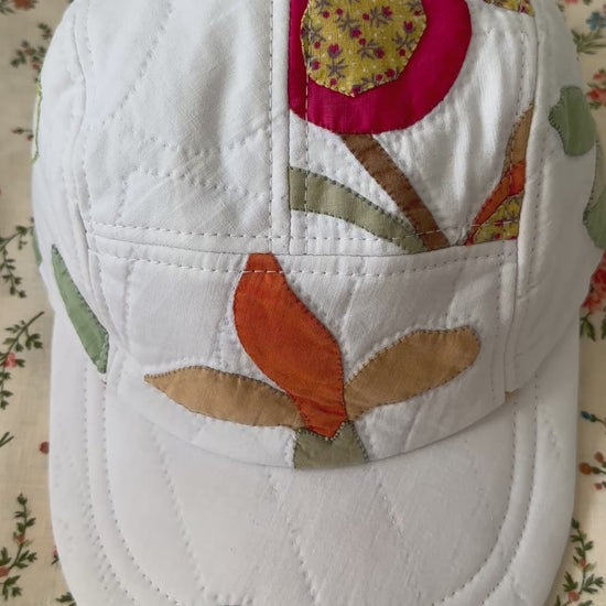 This classic 5-panel hat is upcycled from hand-stitched floral appliquéd vintage cotton quilt. Lined with vintage repro cotton print. Adjustable metal buckle closure.