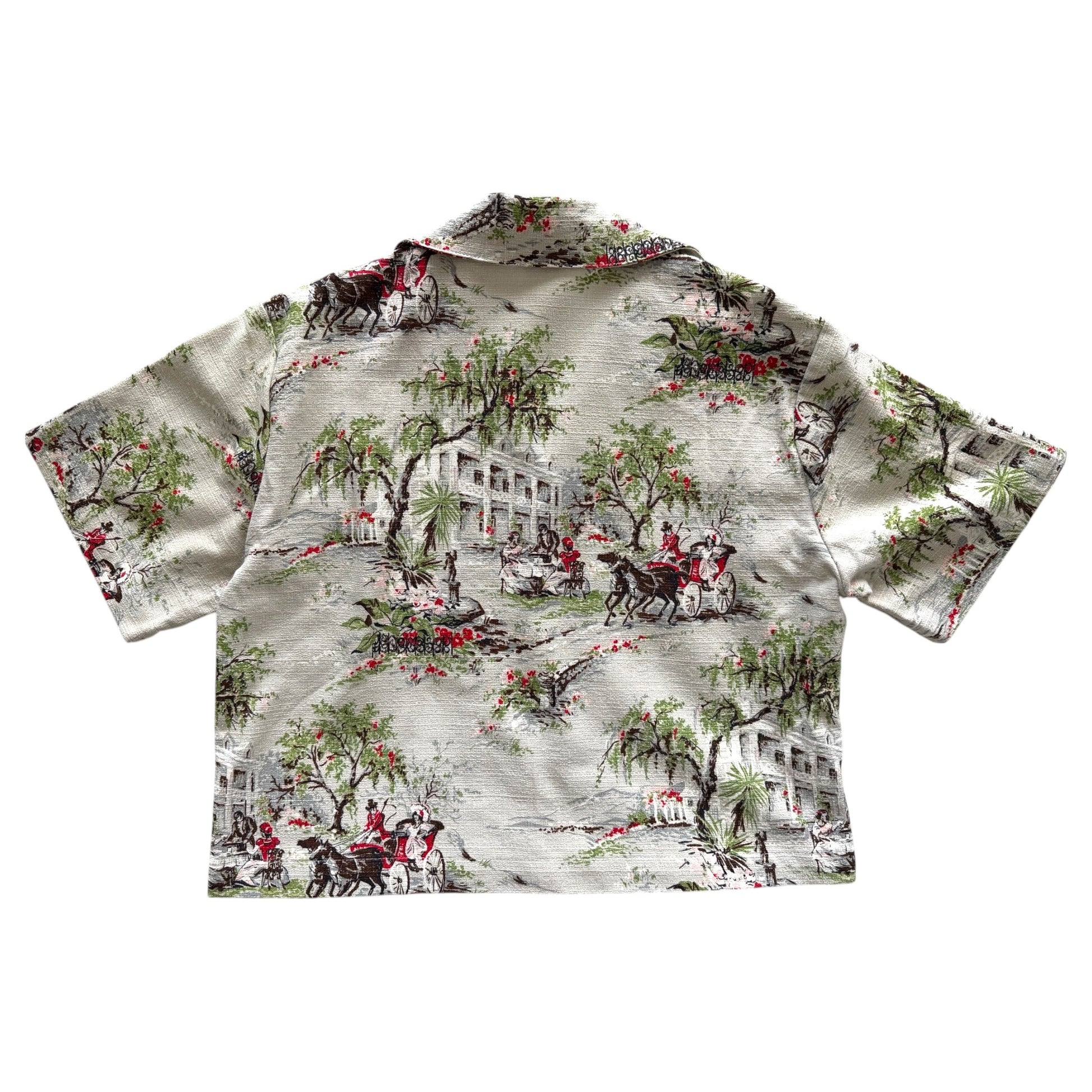 This classic camp shirt silhouette is sewn from vintage 1950’s cotton barkcloth curtain ft early 19th century scene of debutants having tea with another debutant arriving by stagecoach with a colonial mansion in its backdrop. Finished with wood buttons. Seams are chain stitched & serged.