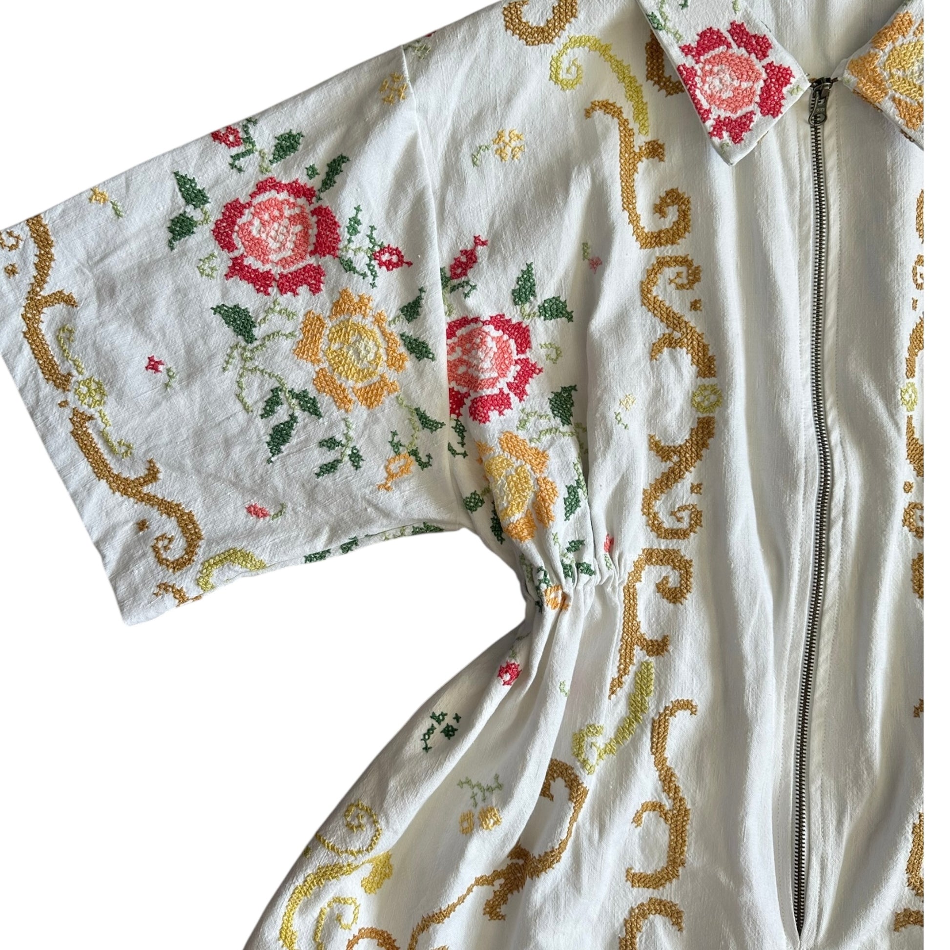 Upcycled from one vintage mid-weight tablecloth with an amazing amount of cross stitching! Side pockets. Seams are chain-stitched and serged. YKK zipper front closure. Cinched elastic waist.