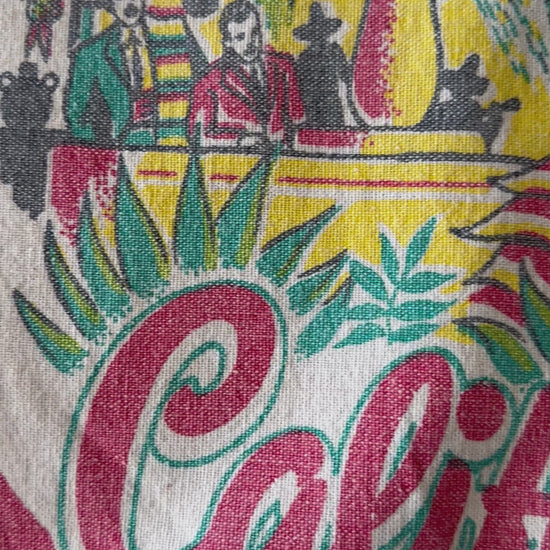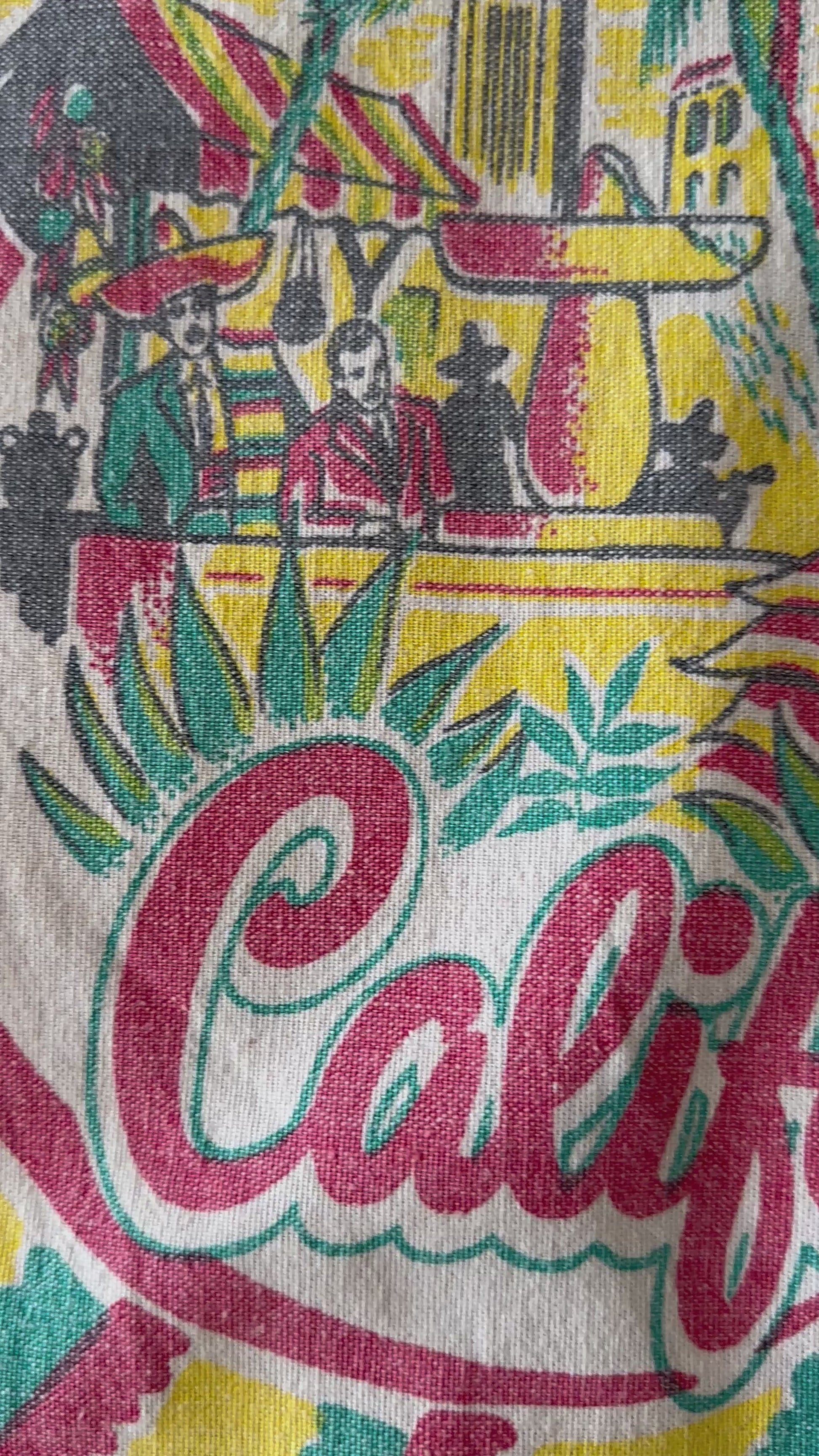 This classic camp shirt silhouette is upcycled from a vtg cactual souvenir tablecloth ft a map of California in back panel. Collar is upcycled from a vintage embroidered tablecloth & body is sewn with mid weight European linen. Seams are chain stitched and serged.