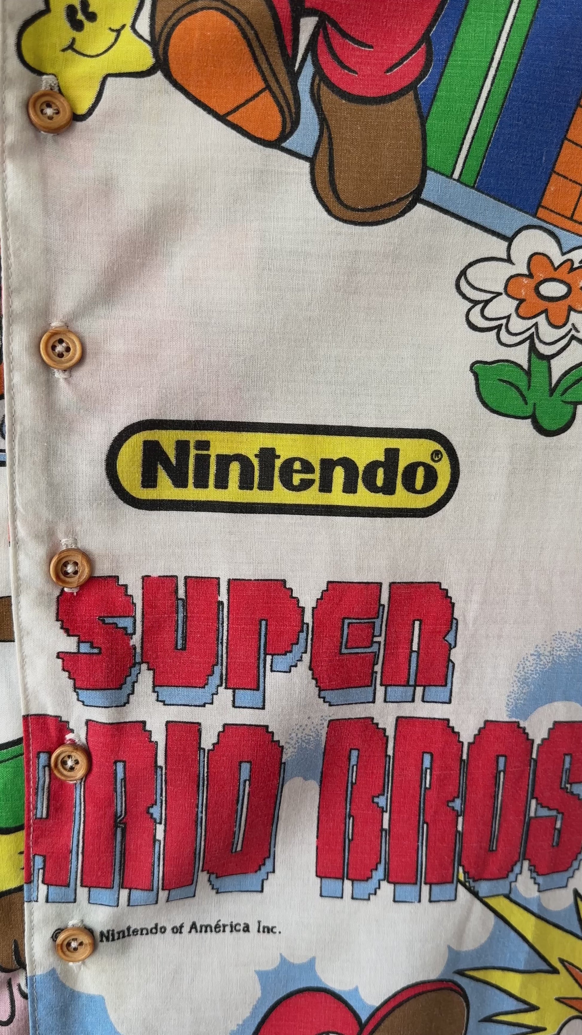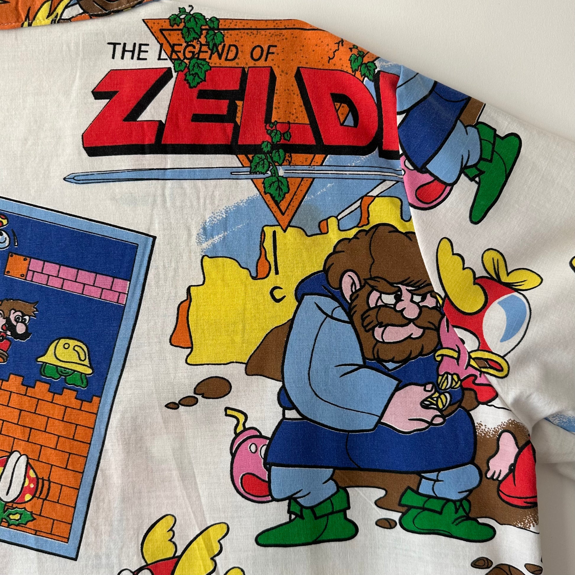 This classic camp shirt silhouette is upcycled from a 1988 Nintendo bedsheet fr Zelda & Super Mario Bros! Seams are chain stitched & serged.