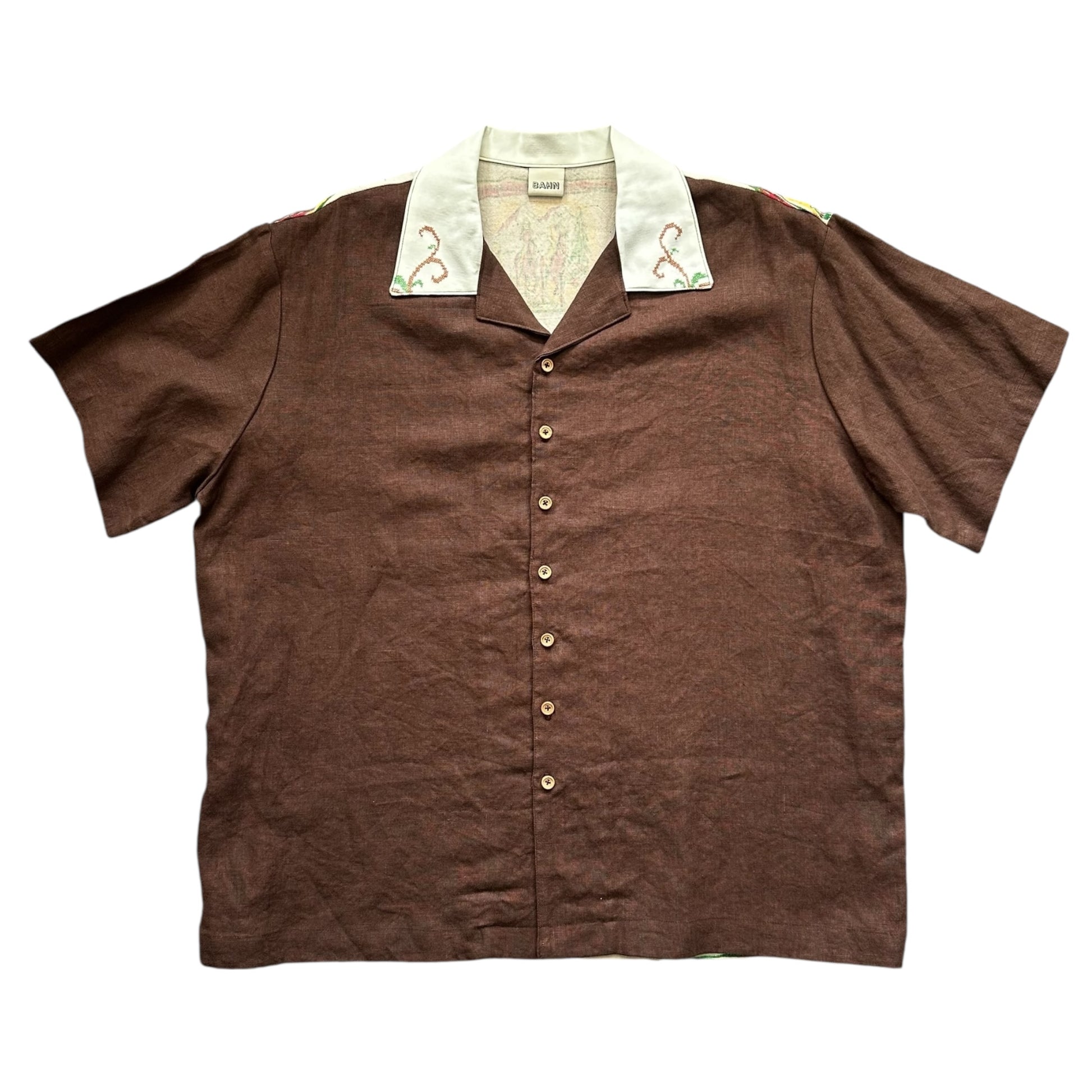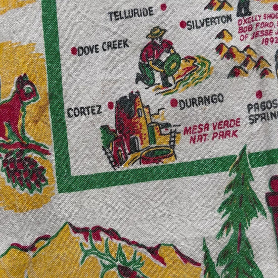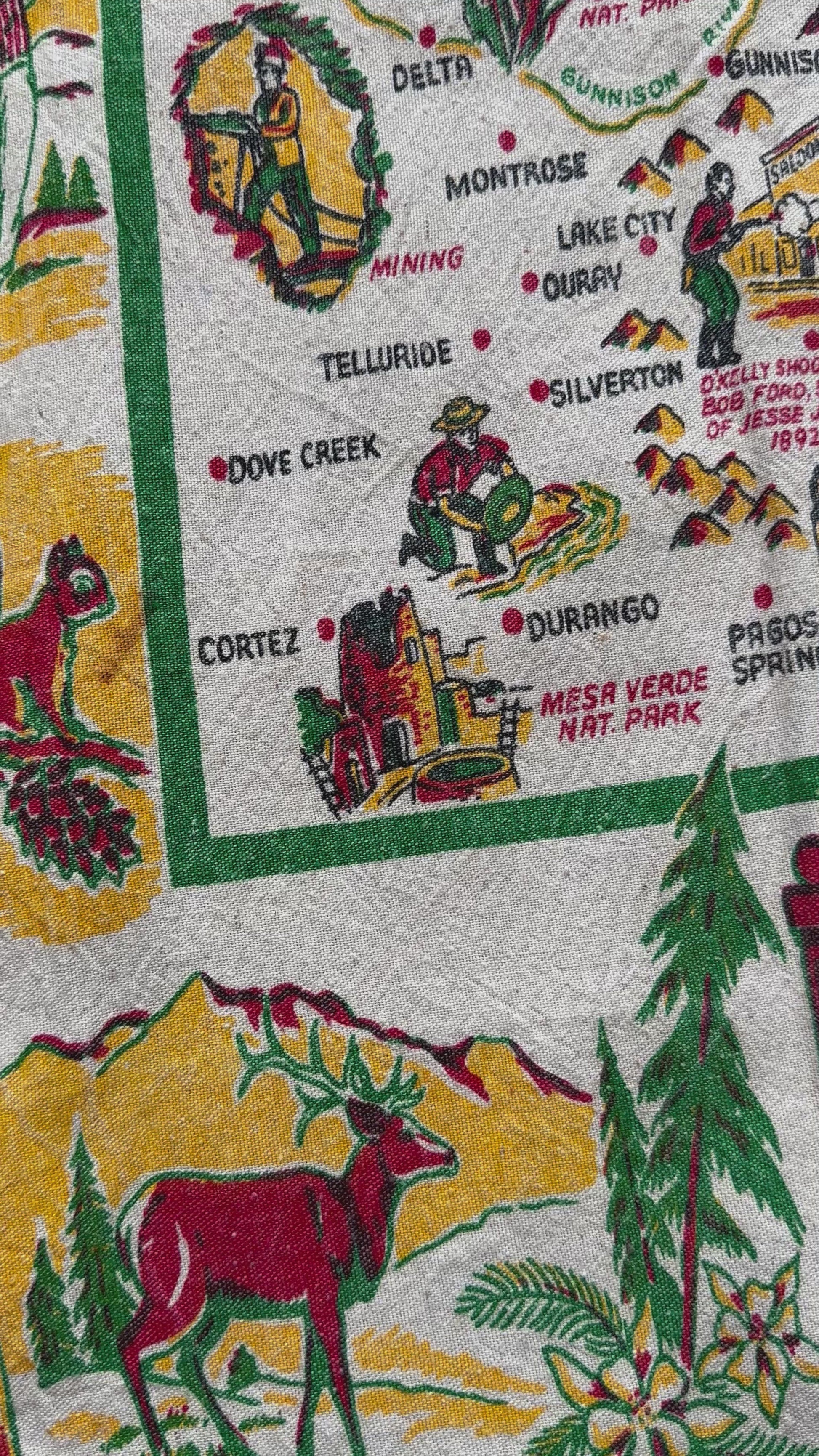 This classic camp shirt silhouette is upcycled from a vtg cactual souvenir tablecloth ft a map of Colorado in back panel. Collar is upcycled from a vintage cRoss stitched tablecloth & body is sewn with mid weight European linen. Seams are chain stitched and serged.
