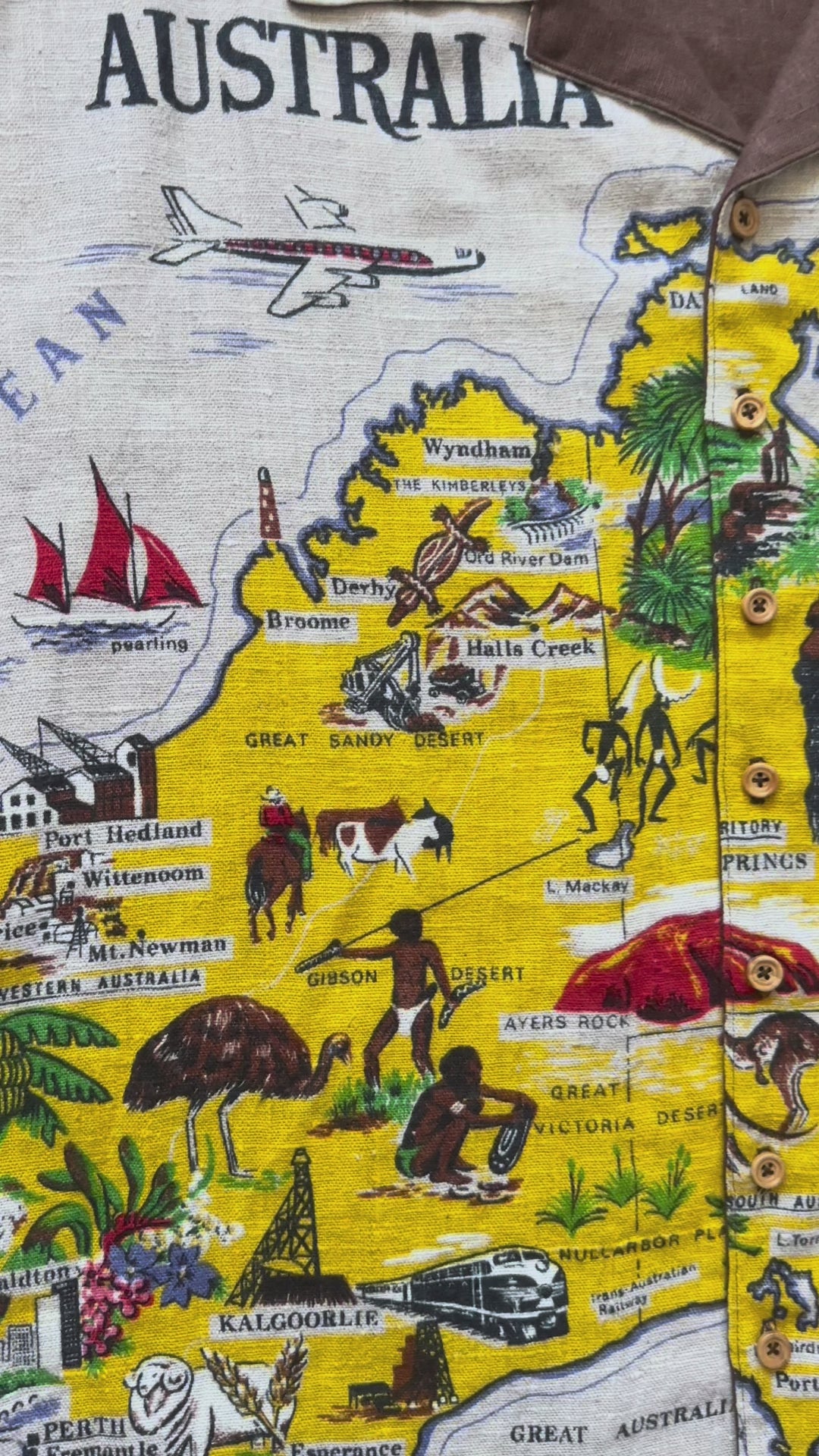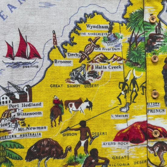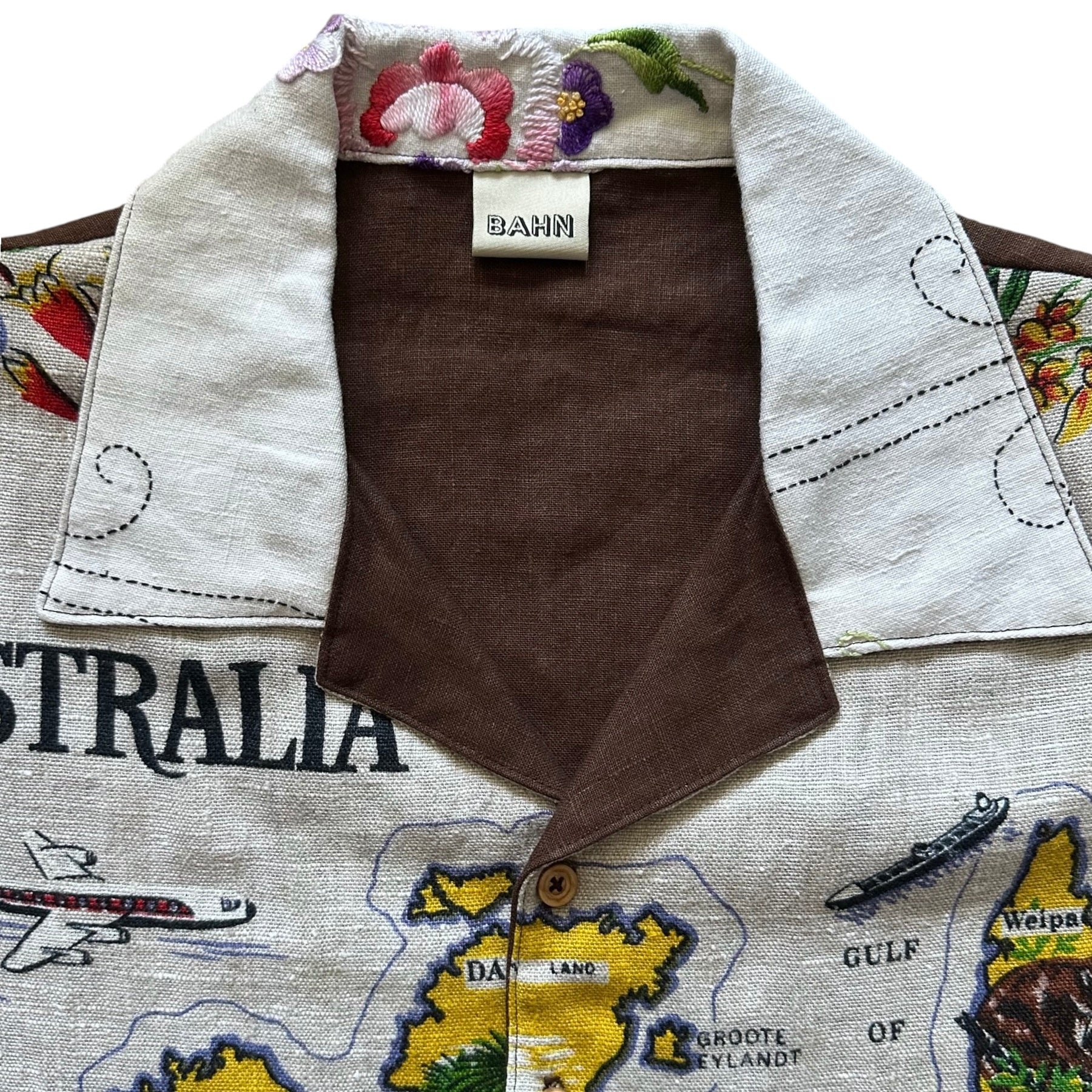 This classic camp shirt silhouette is upcycled from a vtg linen tablecloth ft a map of Australia in front panels. Collar is upcycled from a vintage embroidered tablecloth & body is sewn with mid weight European linen. Seams are chain stitched and serged.