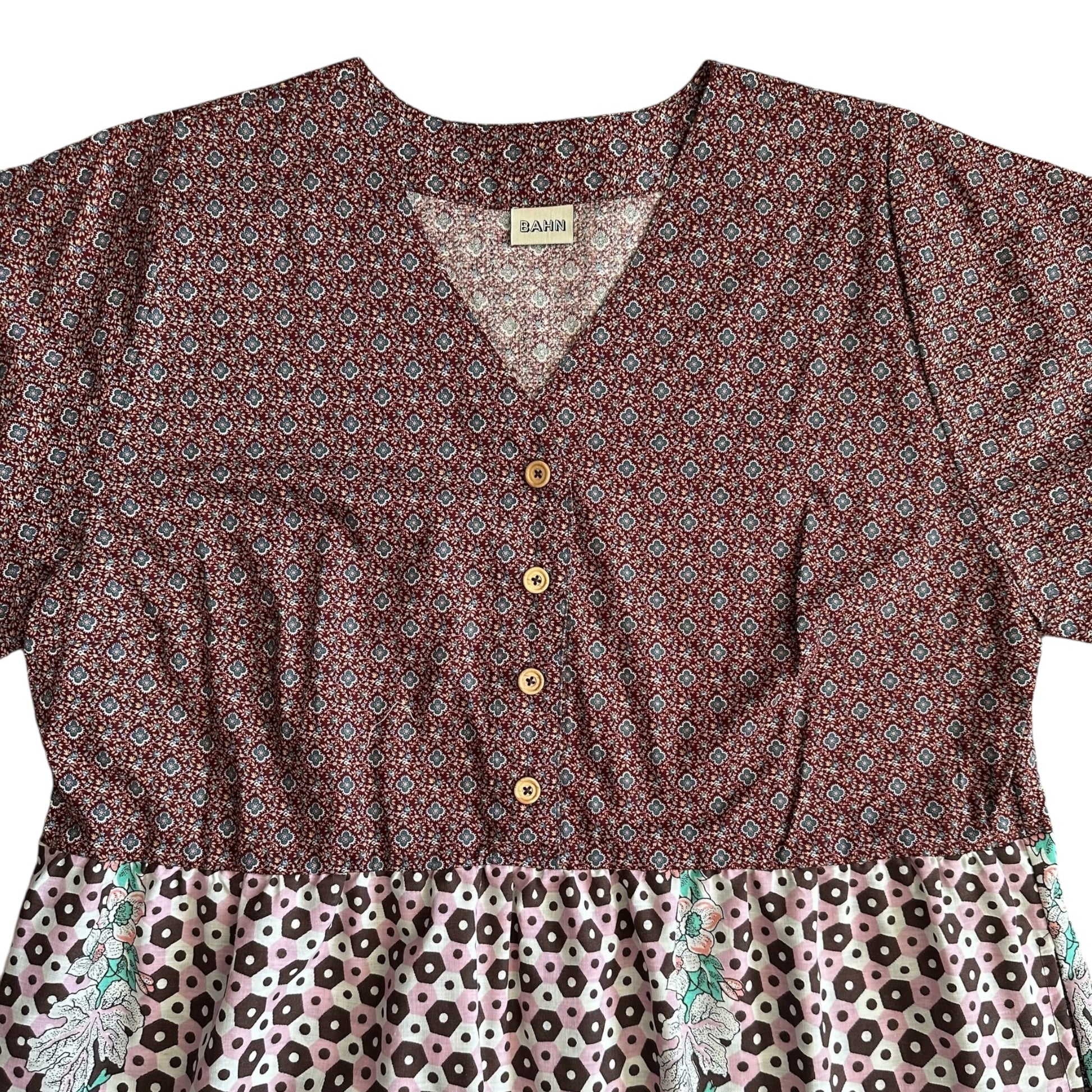 Sewn with NOS vintage 1940-60s floral border cotton fabric. Deep side pockets. Seams are chain-stitched and serged. Finished with wood buttons.