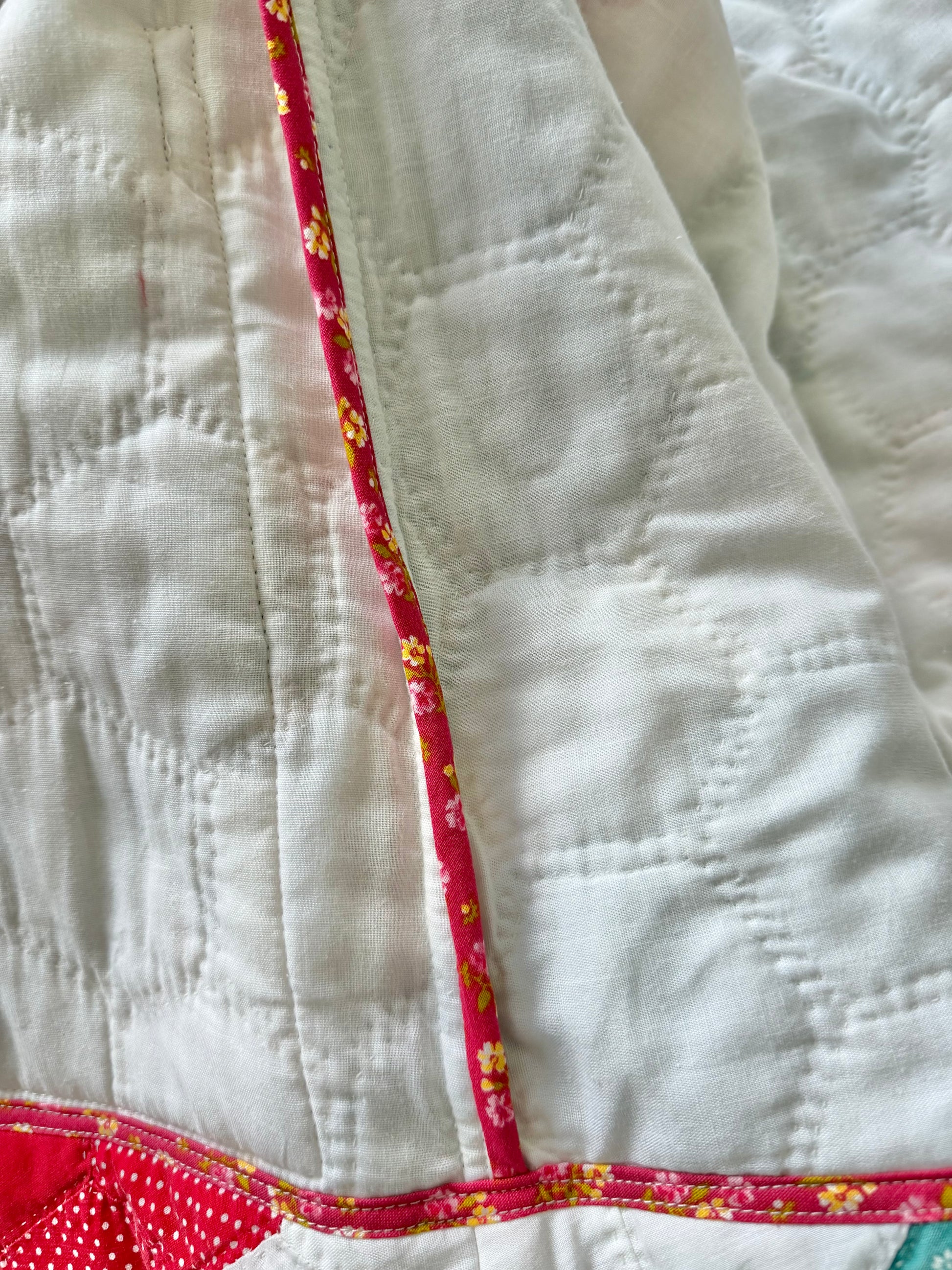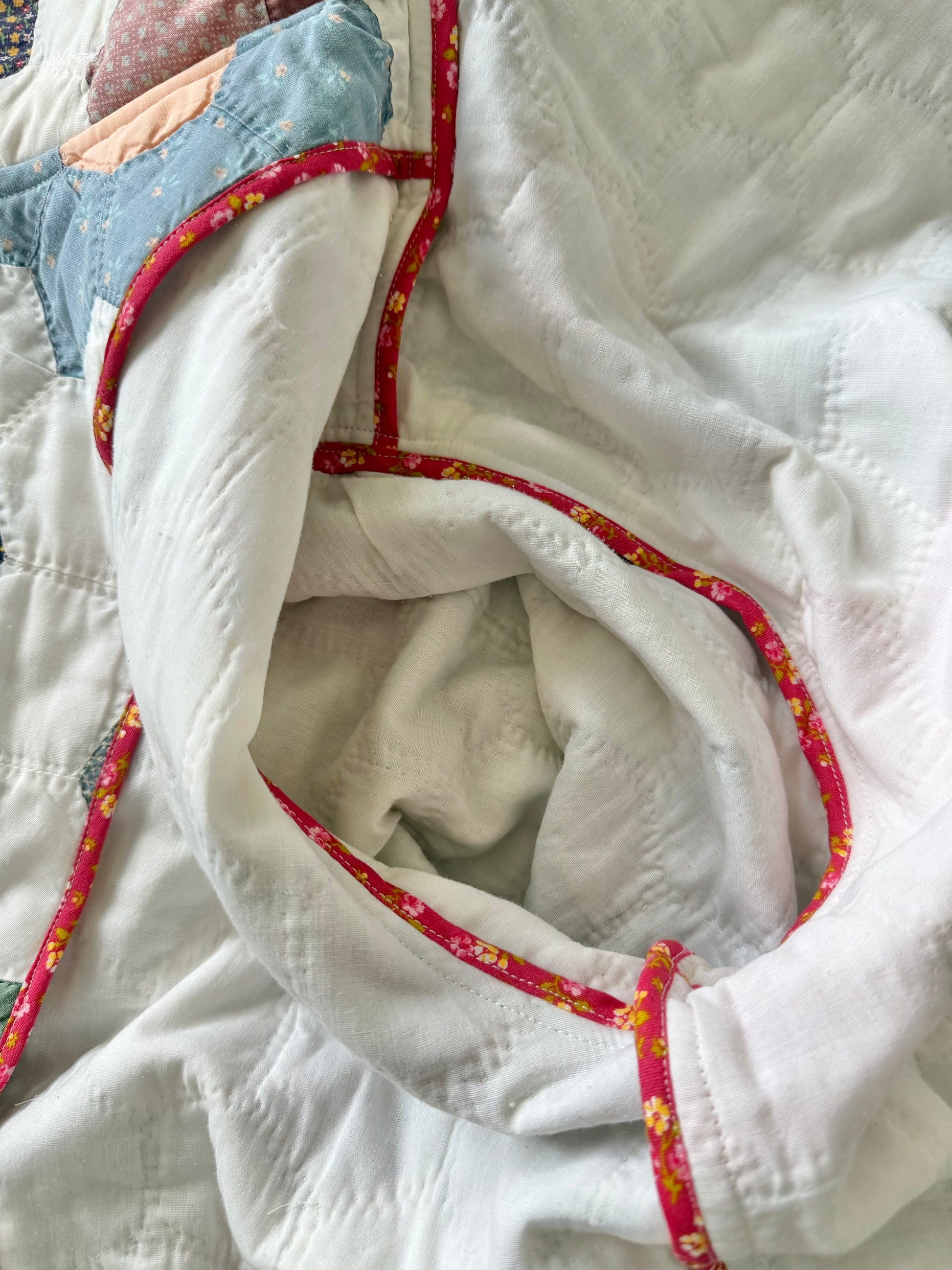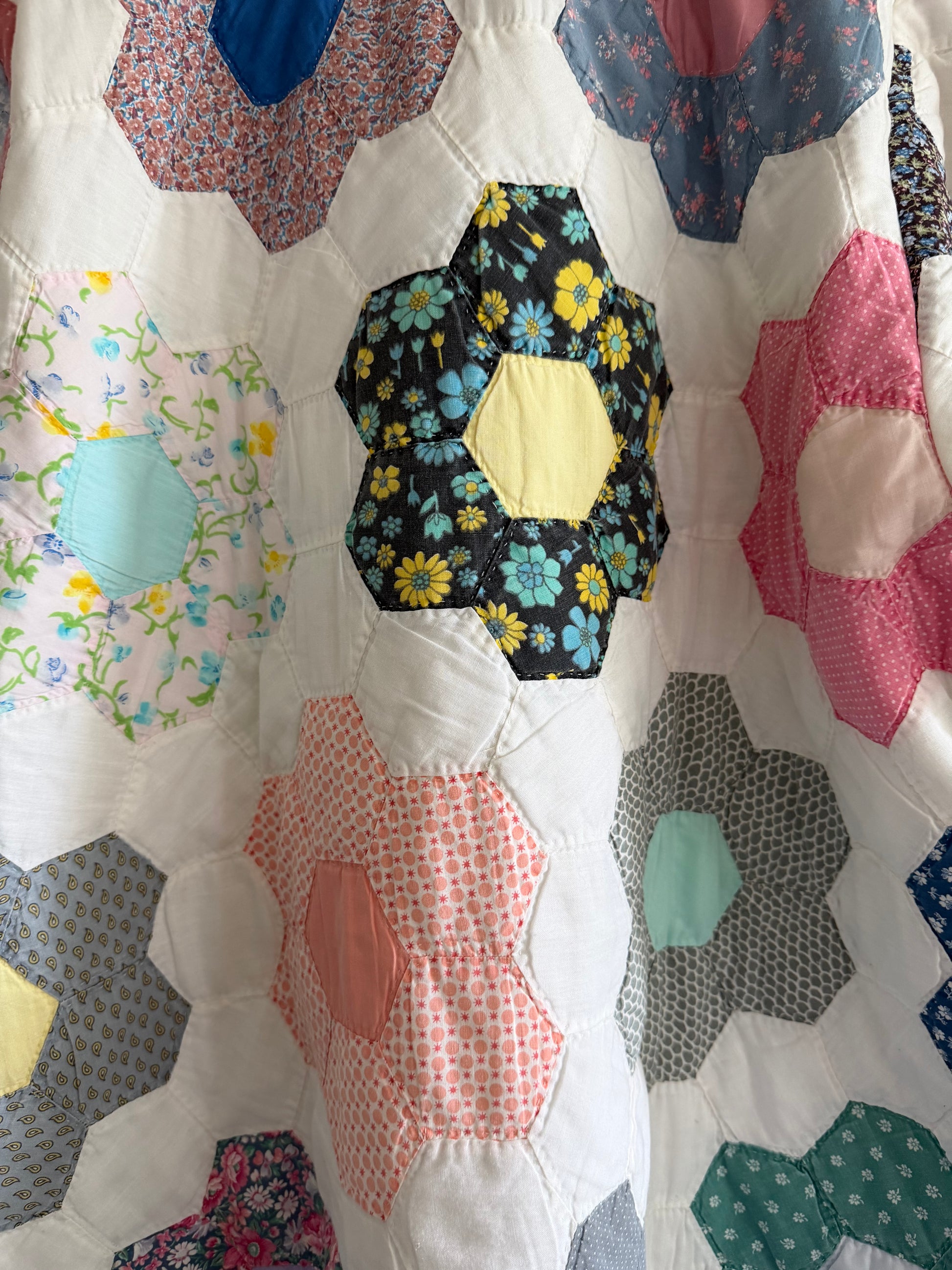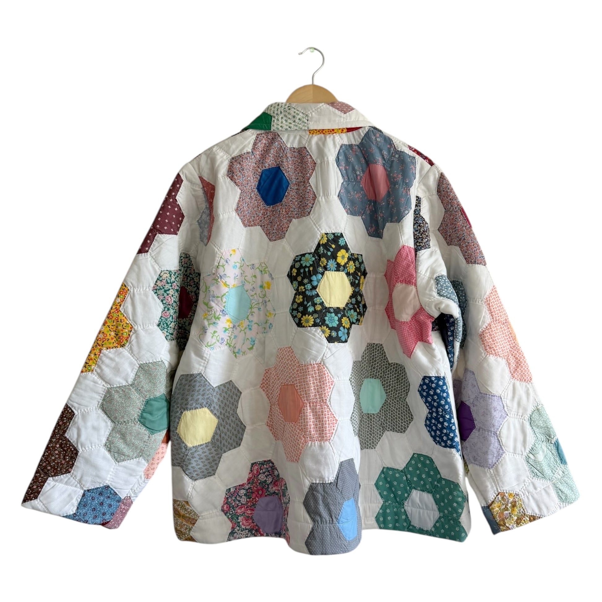Upcycled from vintage 1960-80s hand-stitched hexi cotton quilt in Grandmother’s Garden pattern. Seams are bias bound for durability and longevity.