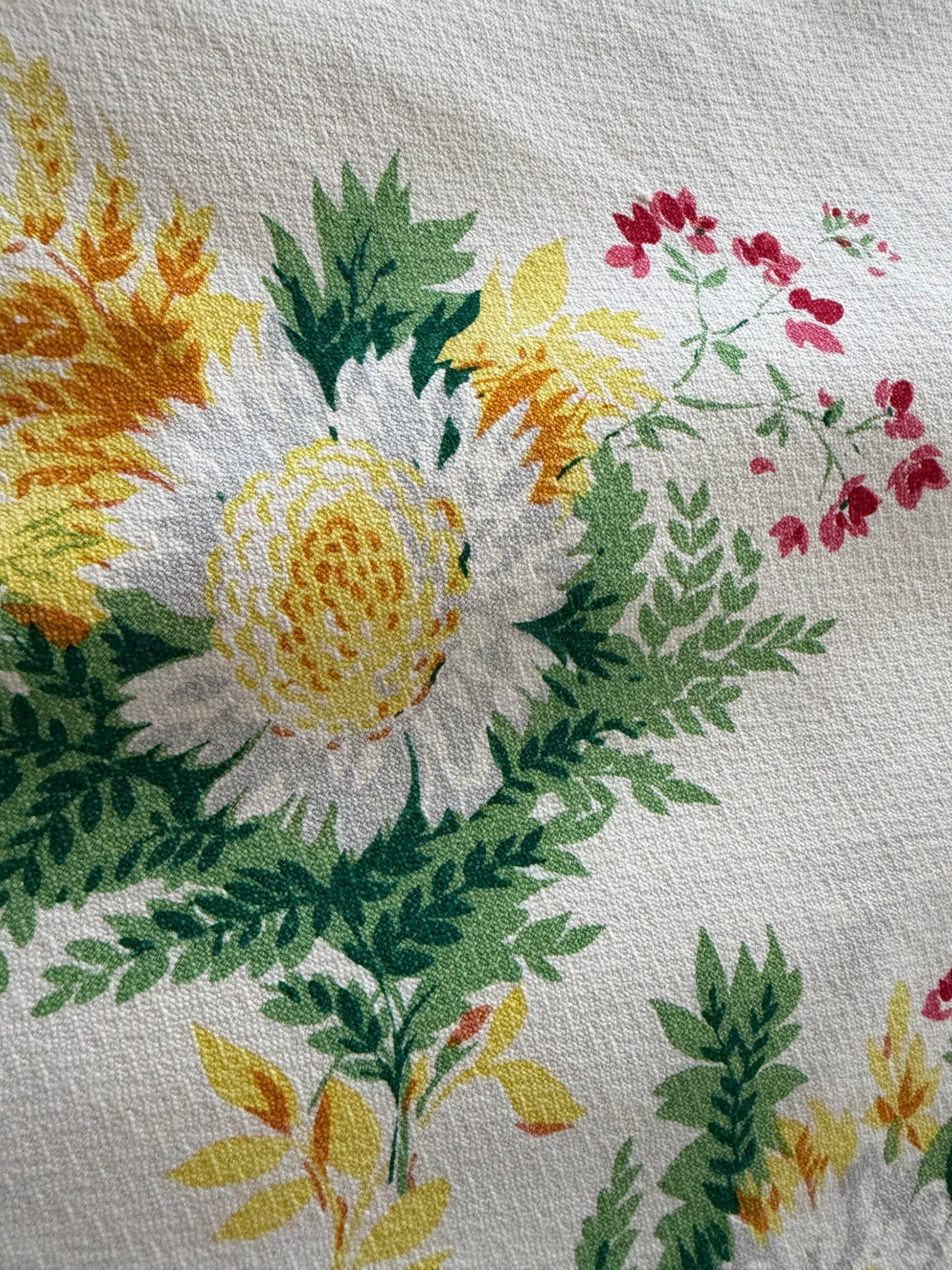 This classic camp shirt silhouette is sewn with vtg 1950’s cotton bark cloth fabric & back panel is upcycled fr vtg 1950’s floral cotton blend tablecloth. Collar, facings, and sleeves are sewn fr deadstock cotton, hemp, linen blend textured neutral fabric. Finished with wood buttons. Seams are chain stitched & serged.