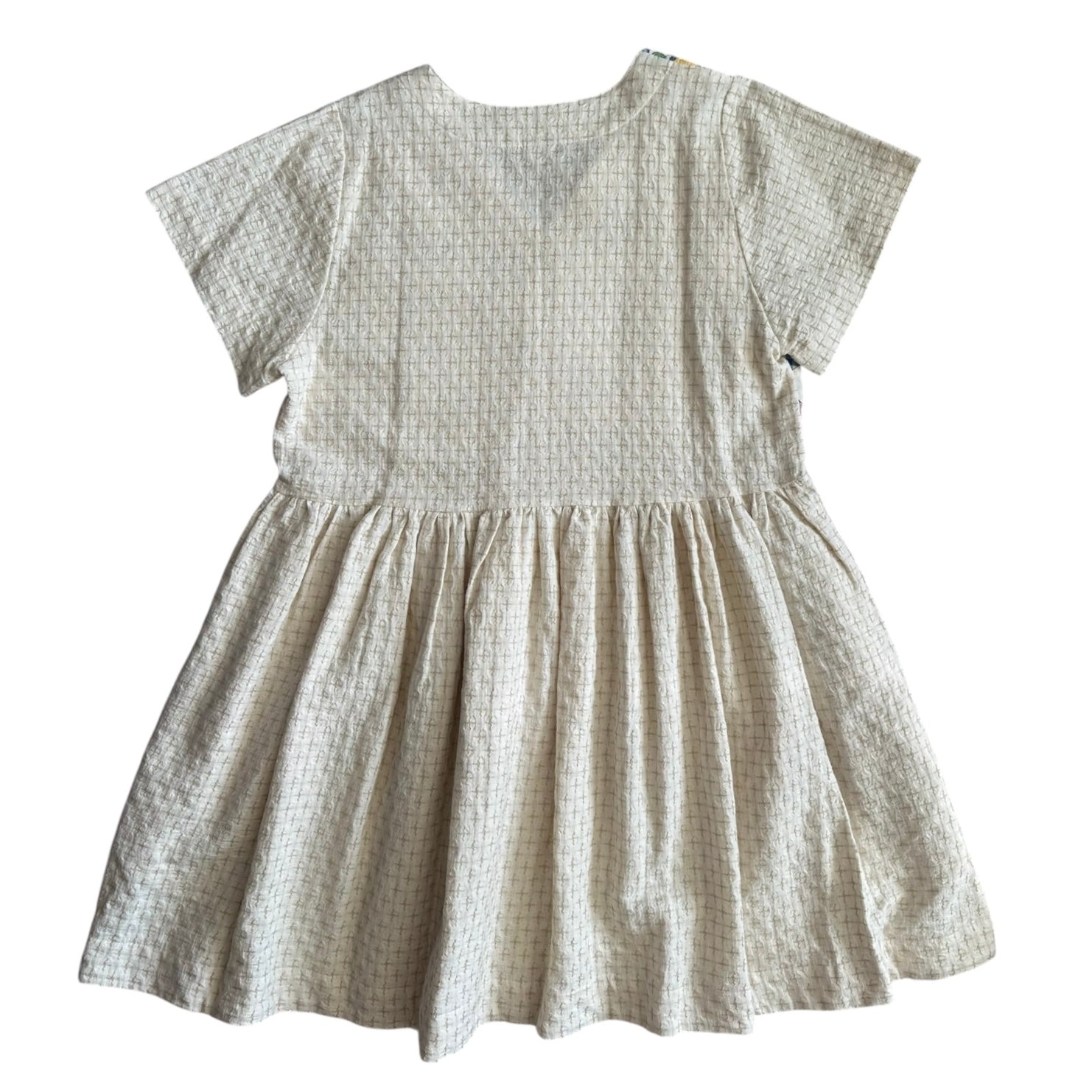Front panel sewn from an unfinished hand stitched vintage hexie cotton quilt top and lined with muslin. Body is sewn with NOS textured cotton fabric. Deep side pockets. Seams are chain-stitched and serged. Finished with wood buttons.