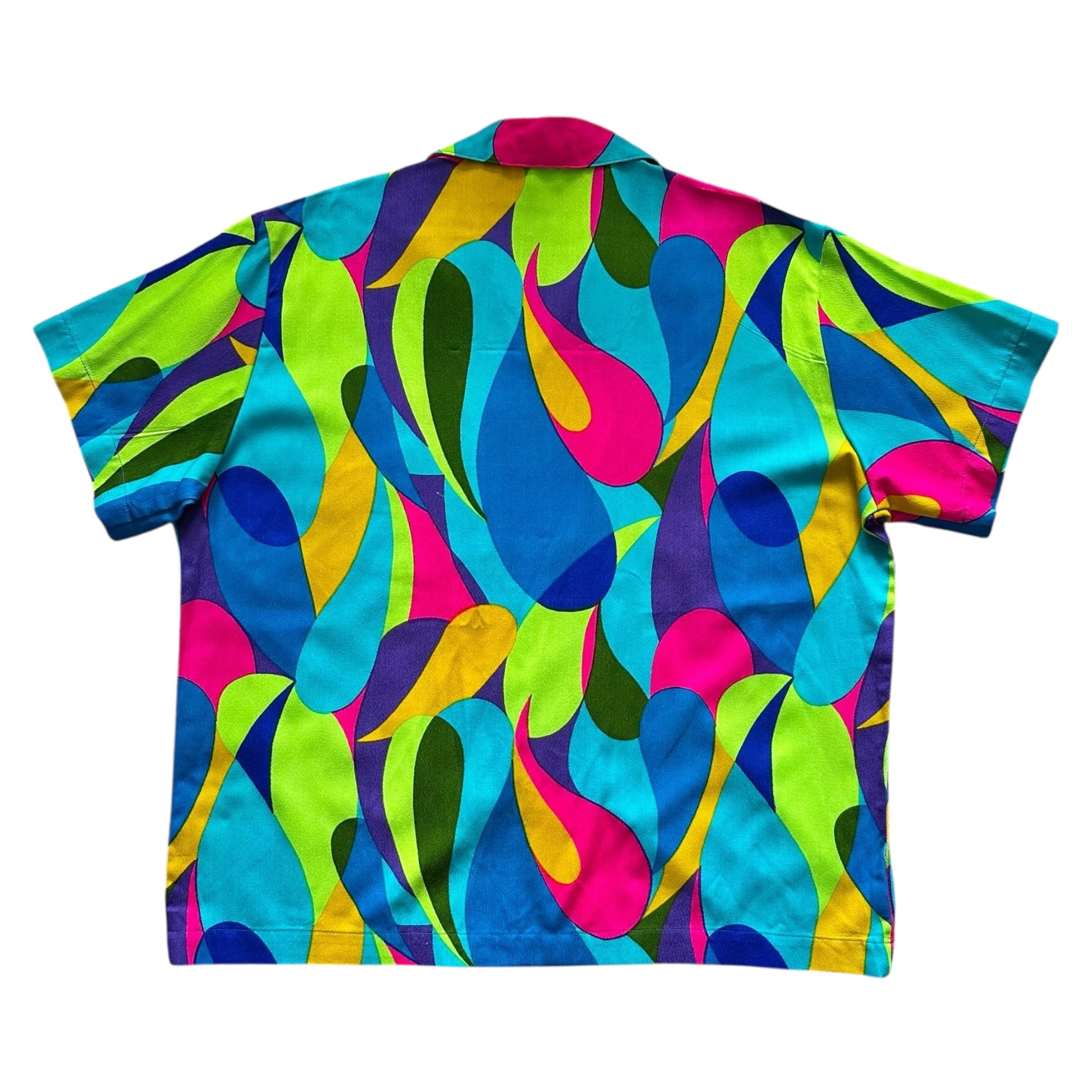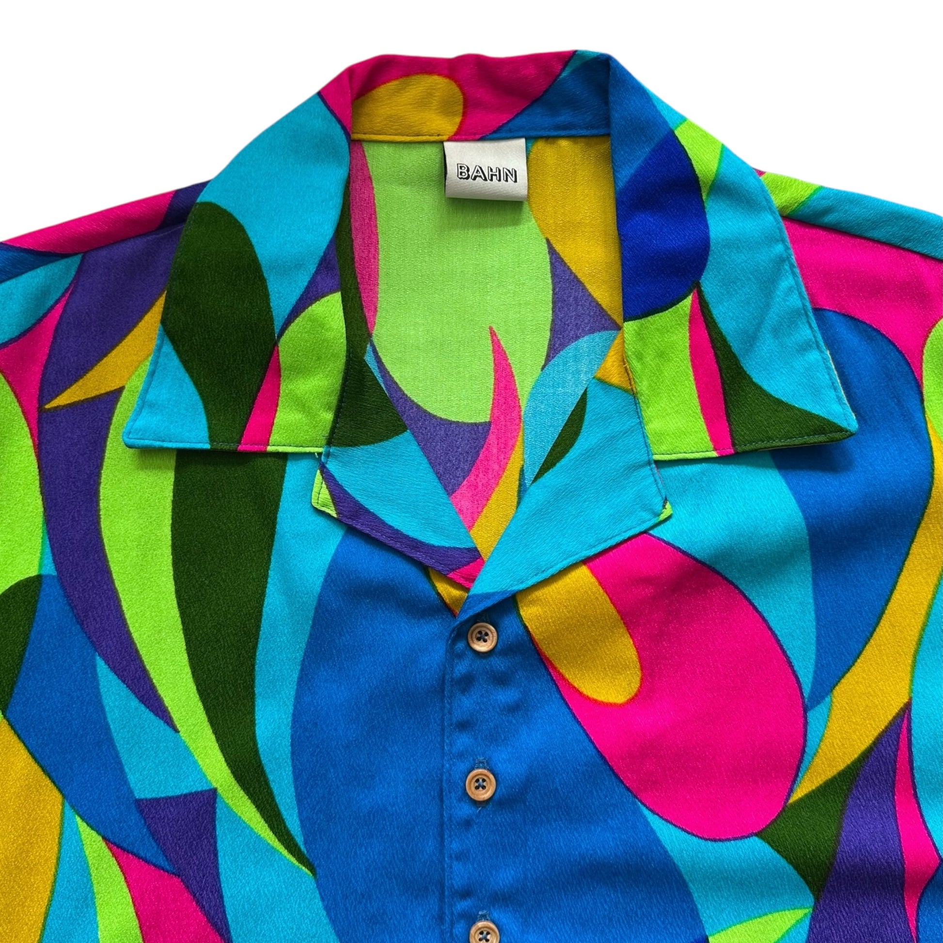 This classic camp shirt silhouette is upcycled from a vtg NOS acrylic barkcloth fabric is bright hues. Seams are chain stitched and serged.