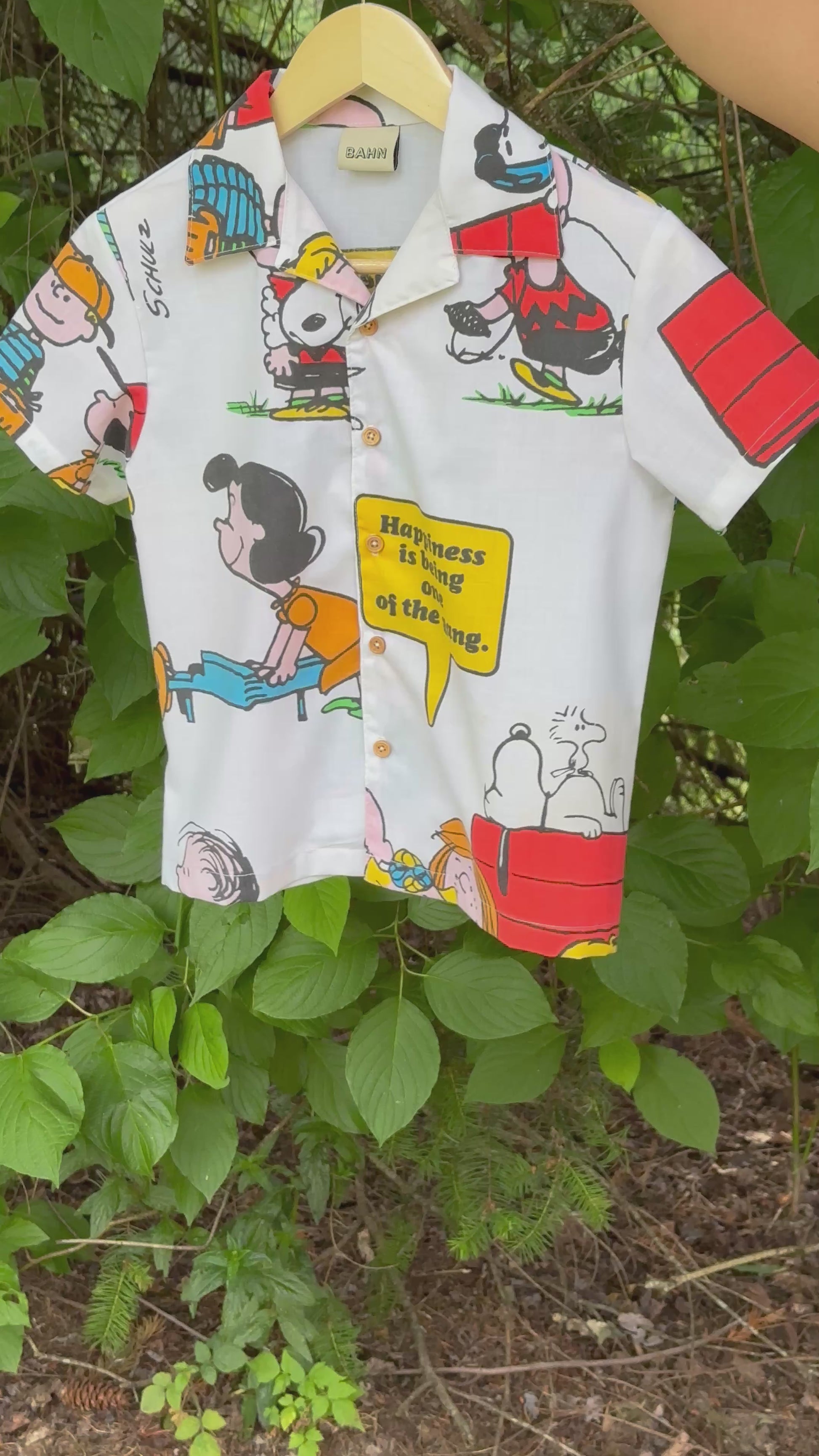This classic camp shirt silhouette is upcycled from a vintage 1971 Peanuts character cotton blend sheet and finished with wood buttons. Seams are chain stitched & serged.
