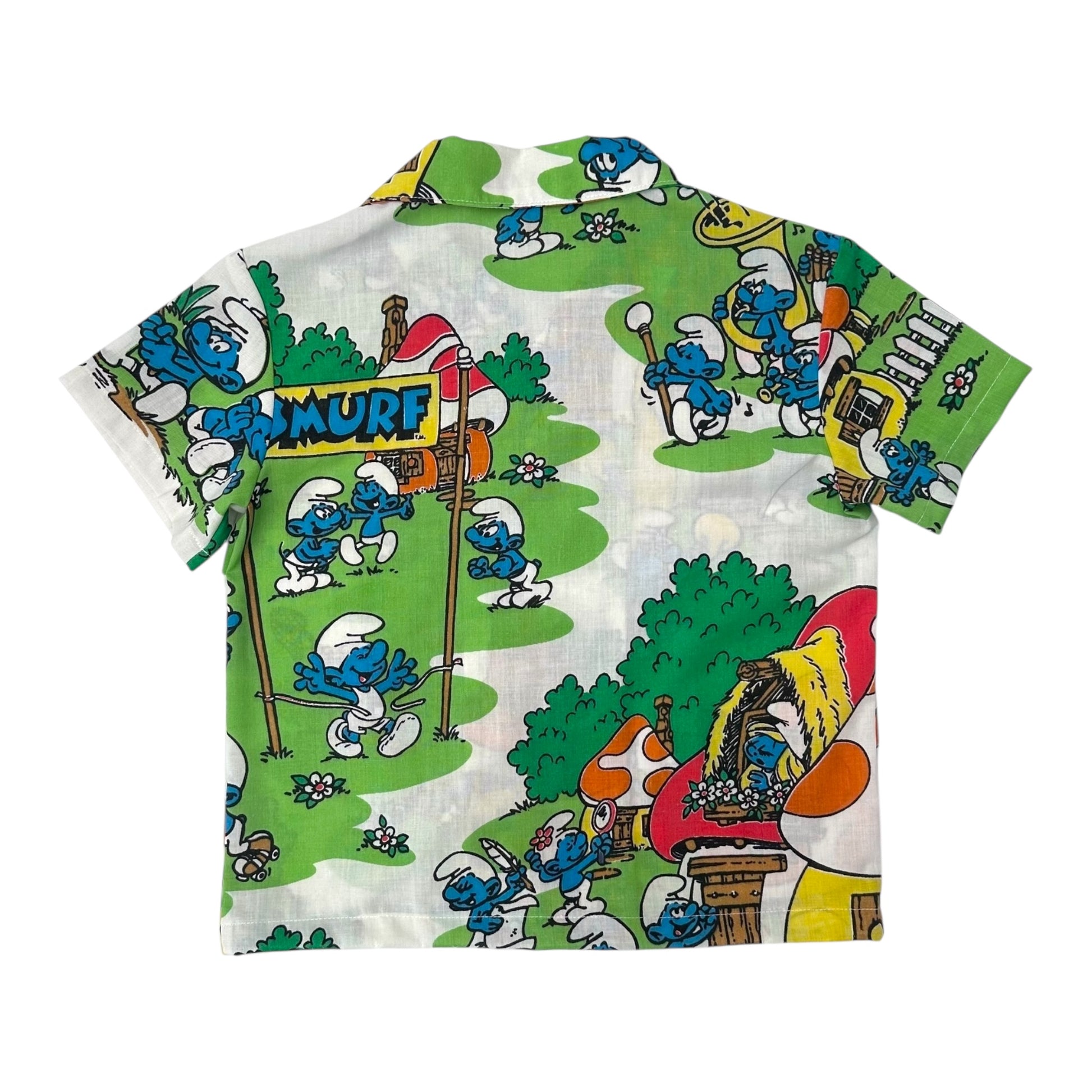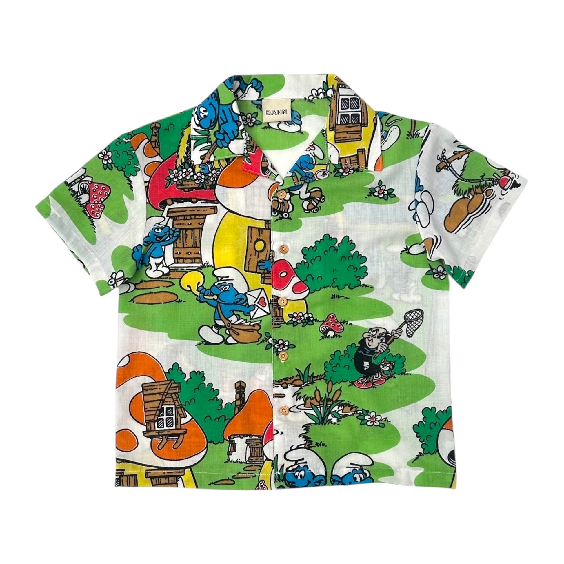 Kids’ camp shirt upcycled fr Smurfs fabric [XL]