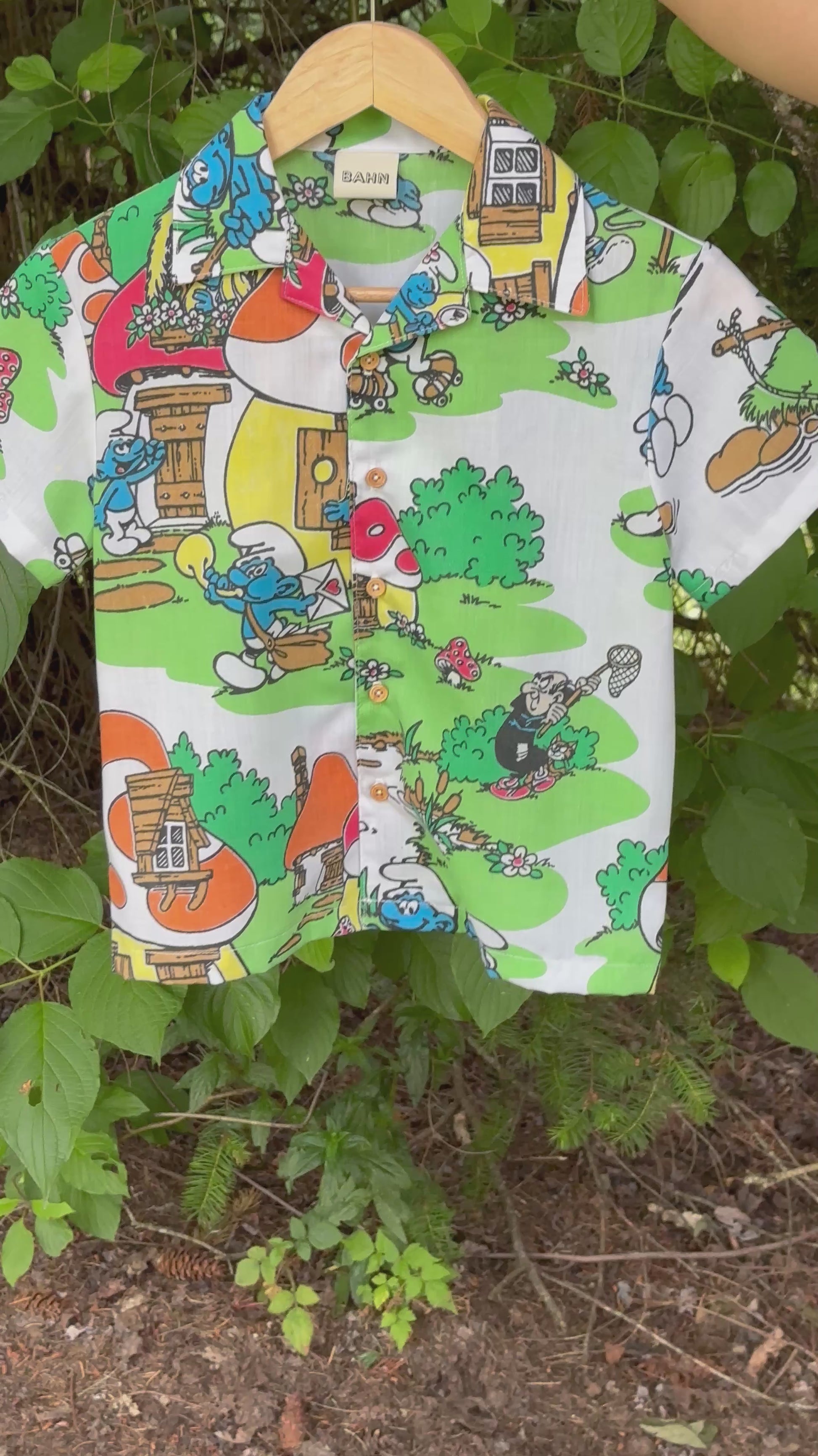 This classic camp shirt silhouette is upcycled from a vintage Smurfs character cotton blend sheet and finished with wood buttons. Seams are chain stitched & serged.
