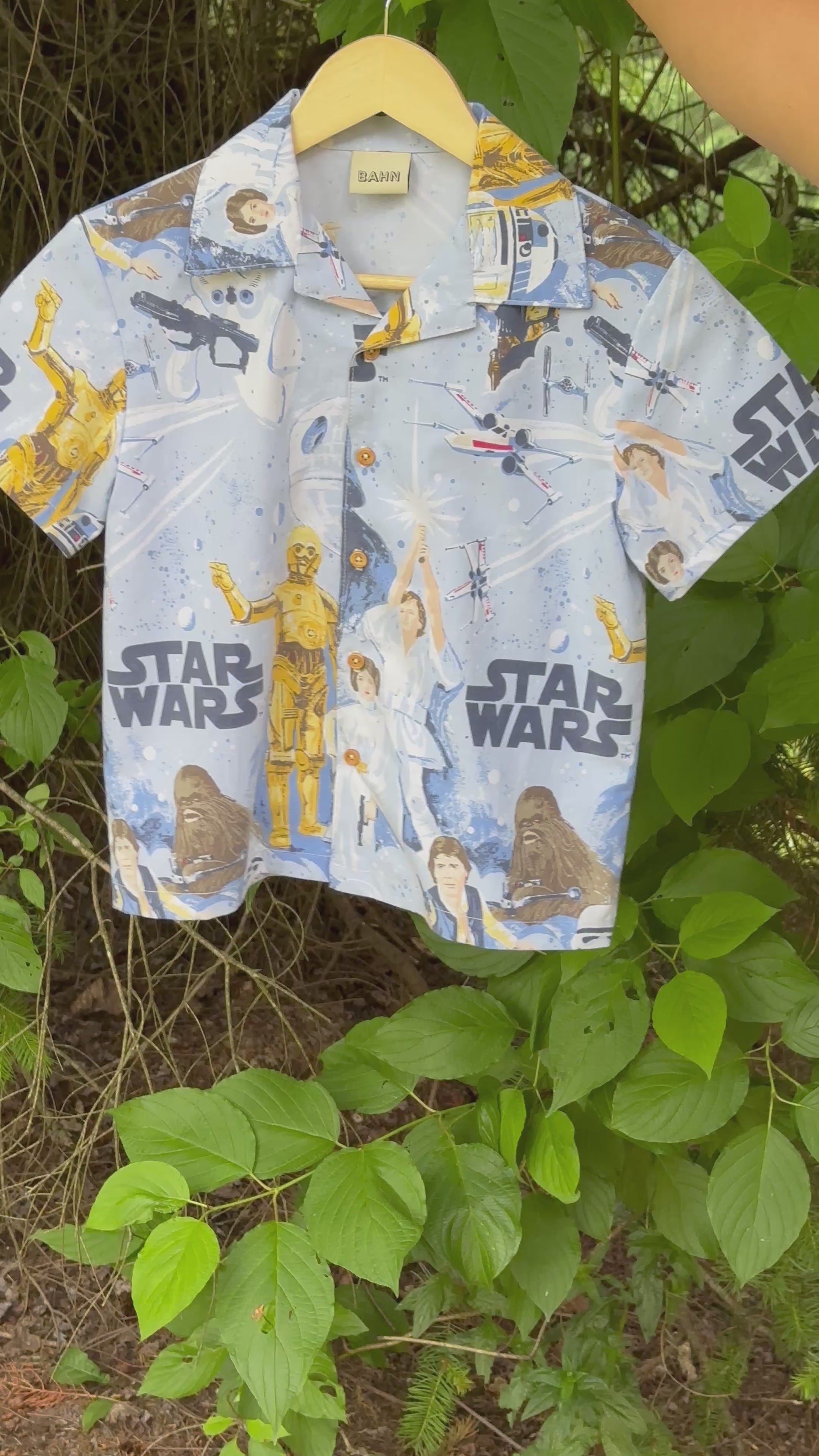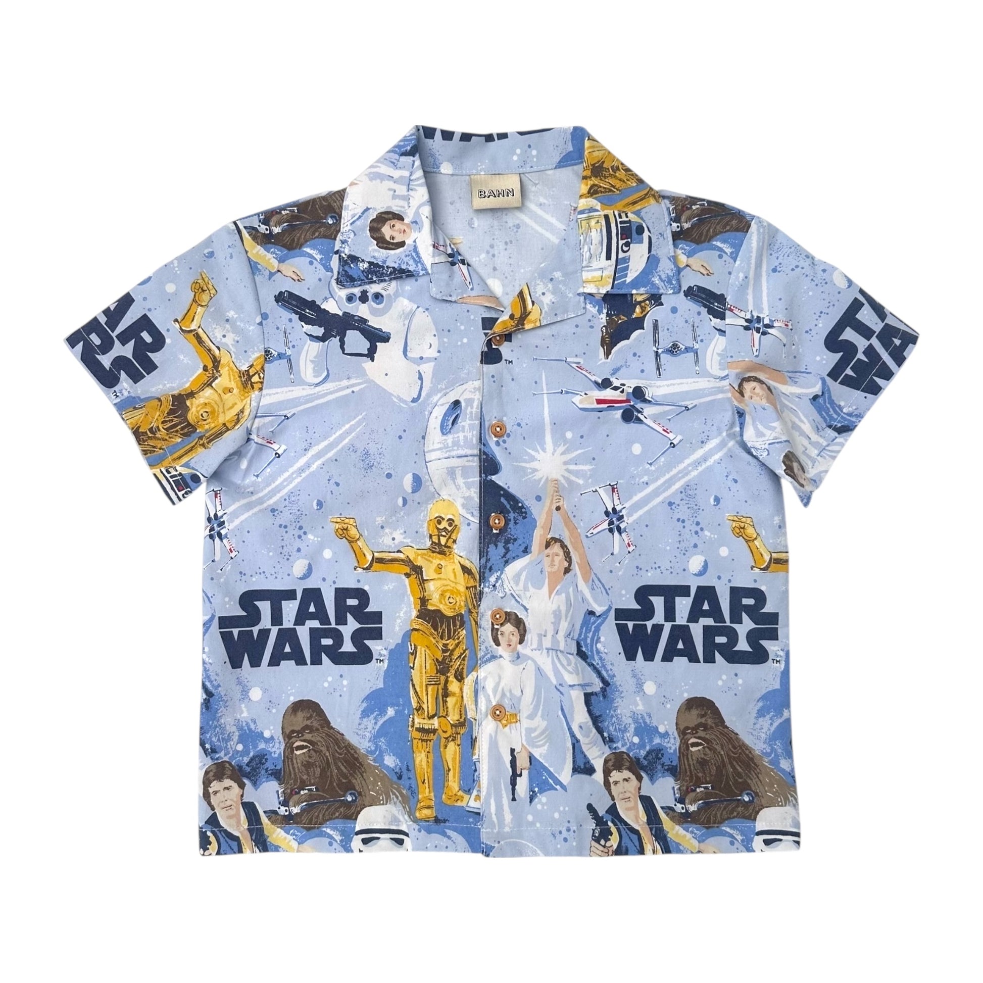 This classic camp shirt silhouette is upcycled from a Star Wars organic cotton fabric and finished with wood buttons. Seams are chain stitched & serged.