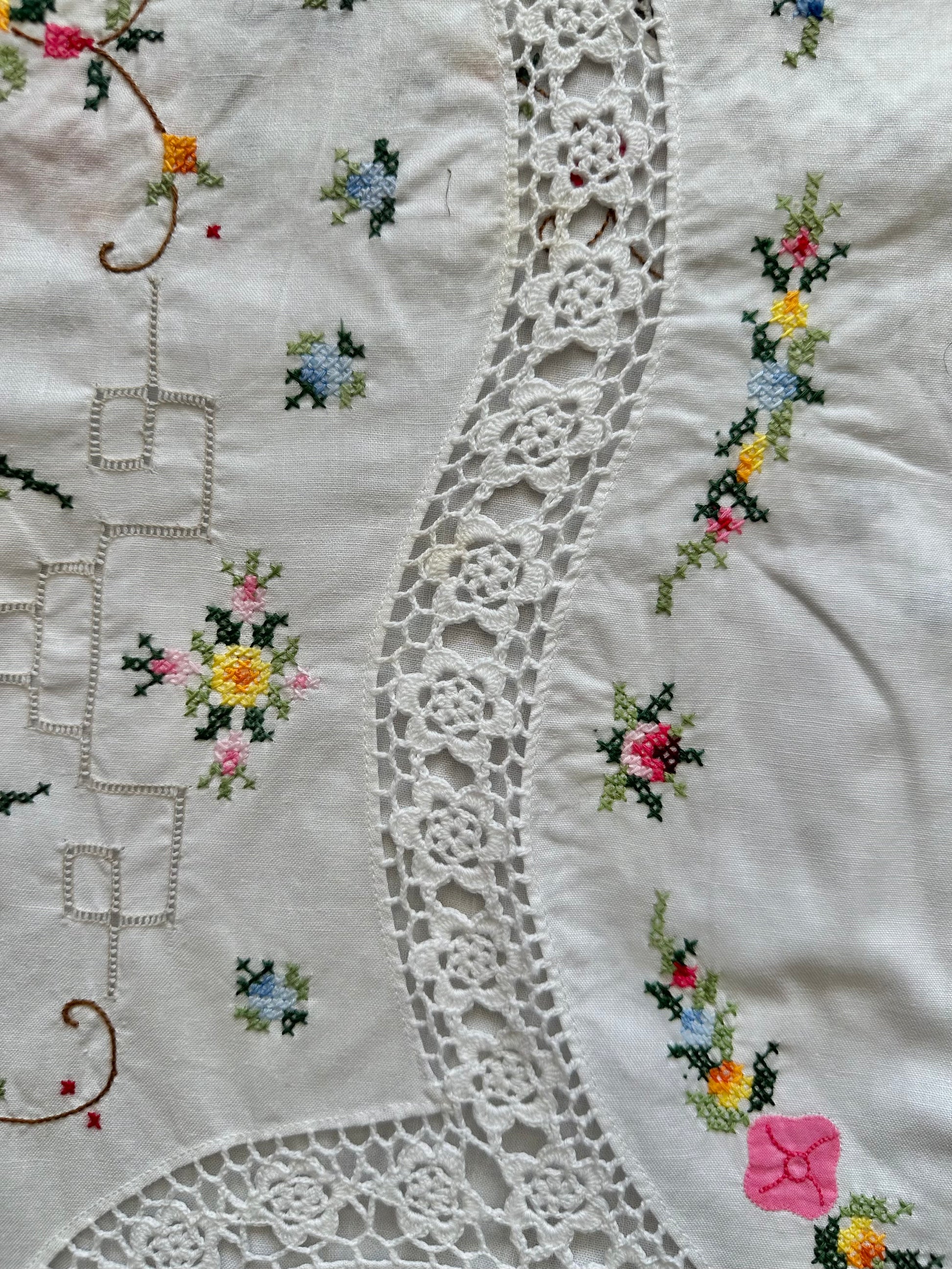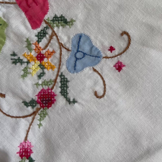 Upcycled from vintage tablecloth ft crochet and floral applique details. Collar and button placket are interfaced. Seams are chain-stitched and serged. Finished with wood buttons.
