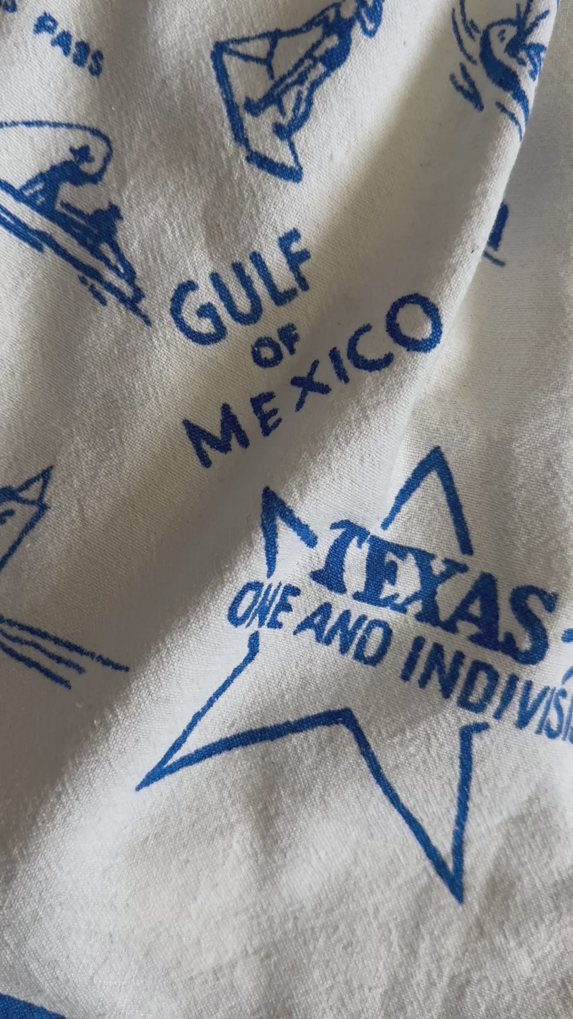 Upcycled from a vintage cotton tablecloth featuring a map of the Lone Star State. Sleeves, collar, and back panel from hemp, linen, cotton blend. Side pockets. Seams are chain-stitched and serged. YKK zipper front closure. Cinched elastic waist.
