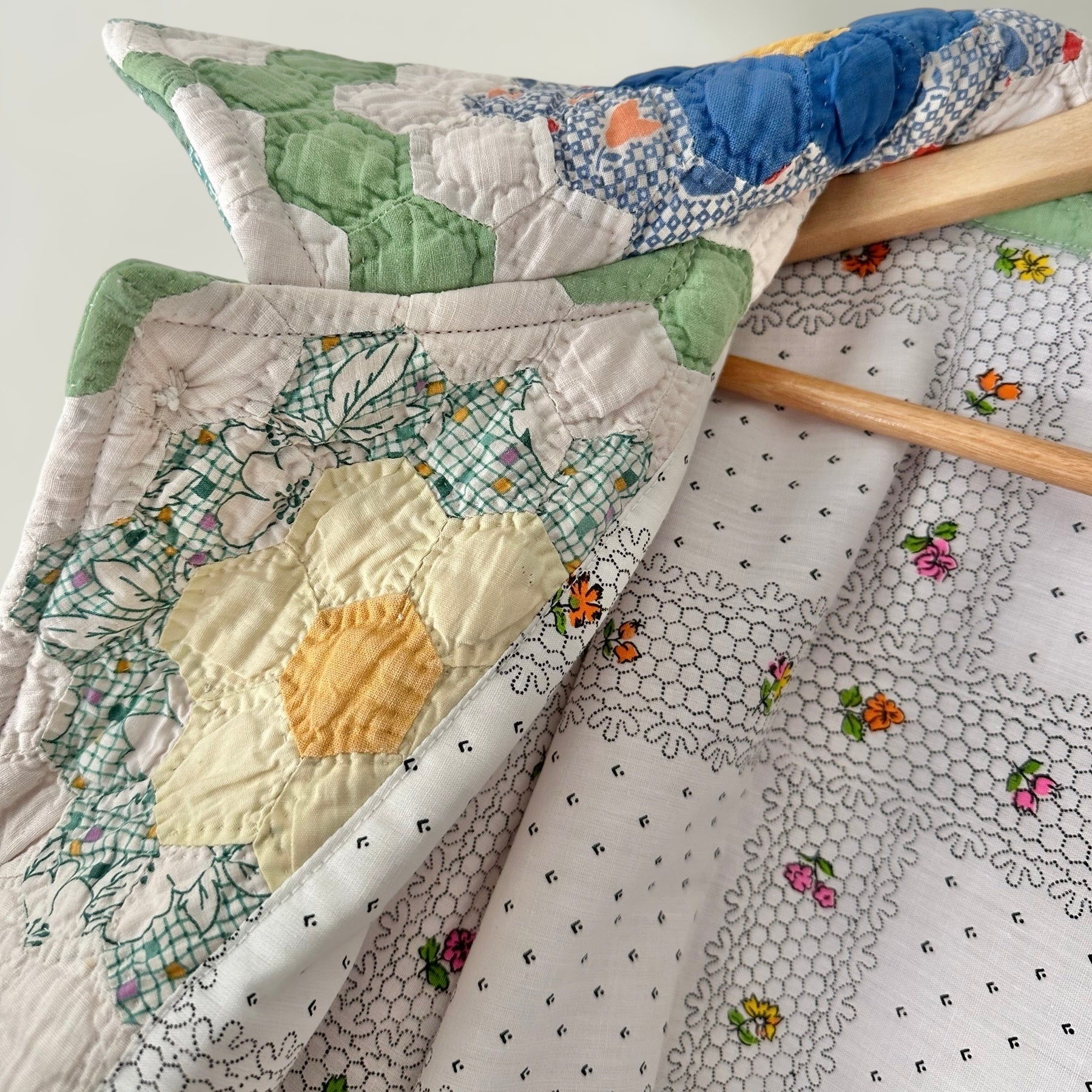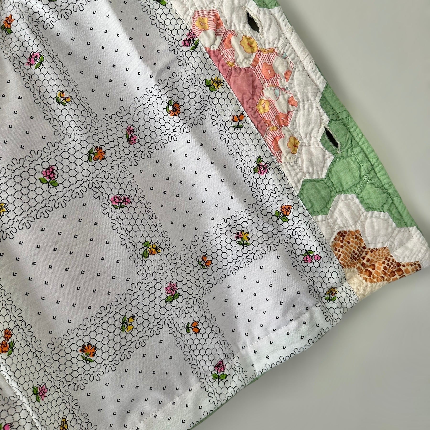 Upcycled from vintage 1960-80s hand-stitched cotton quilt in Grandmother's Flower Garden pattern. Lined with vintage cotton fabric.