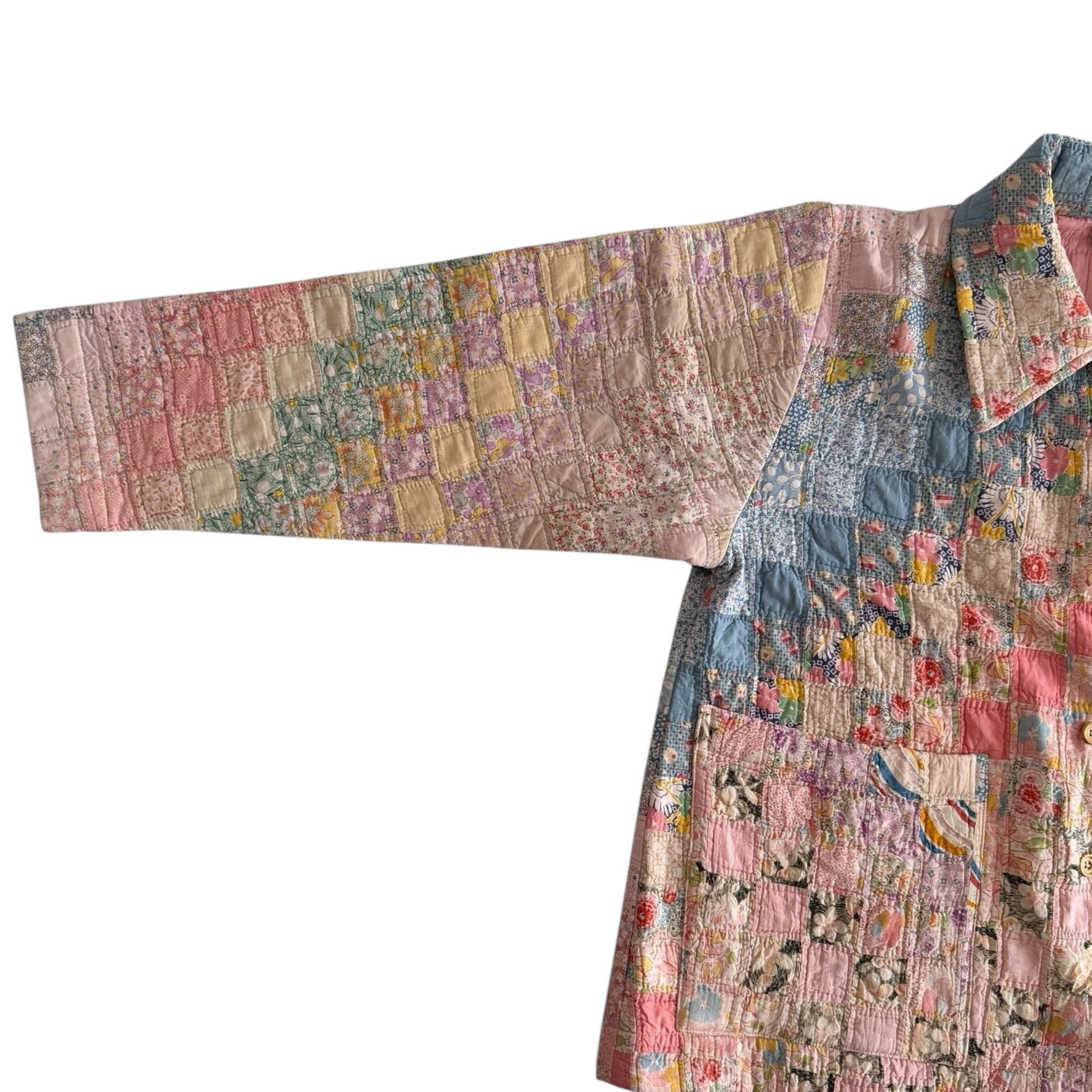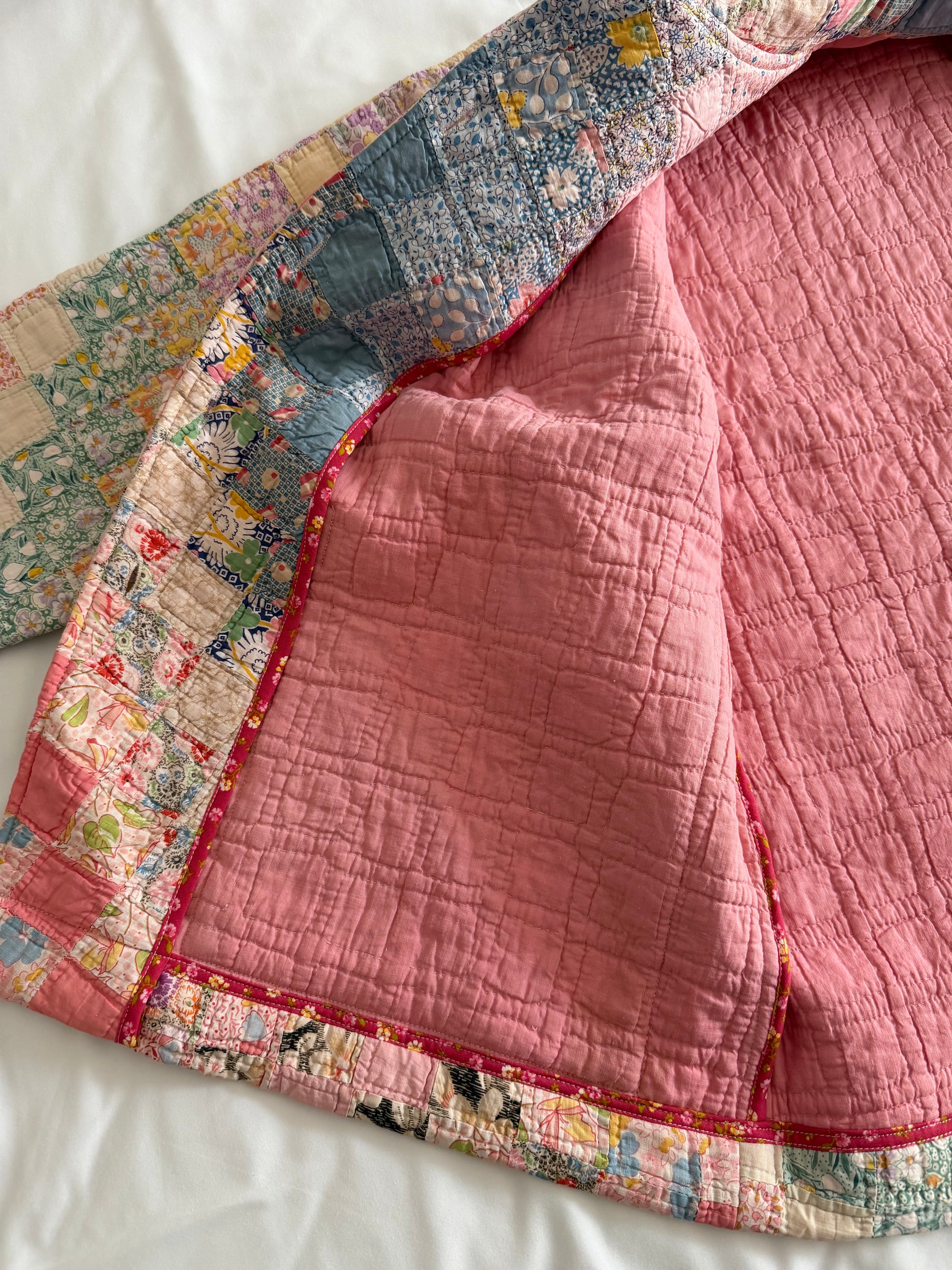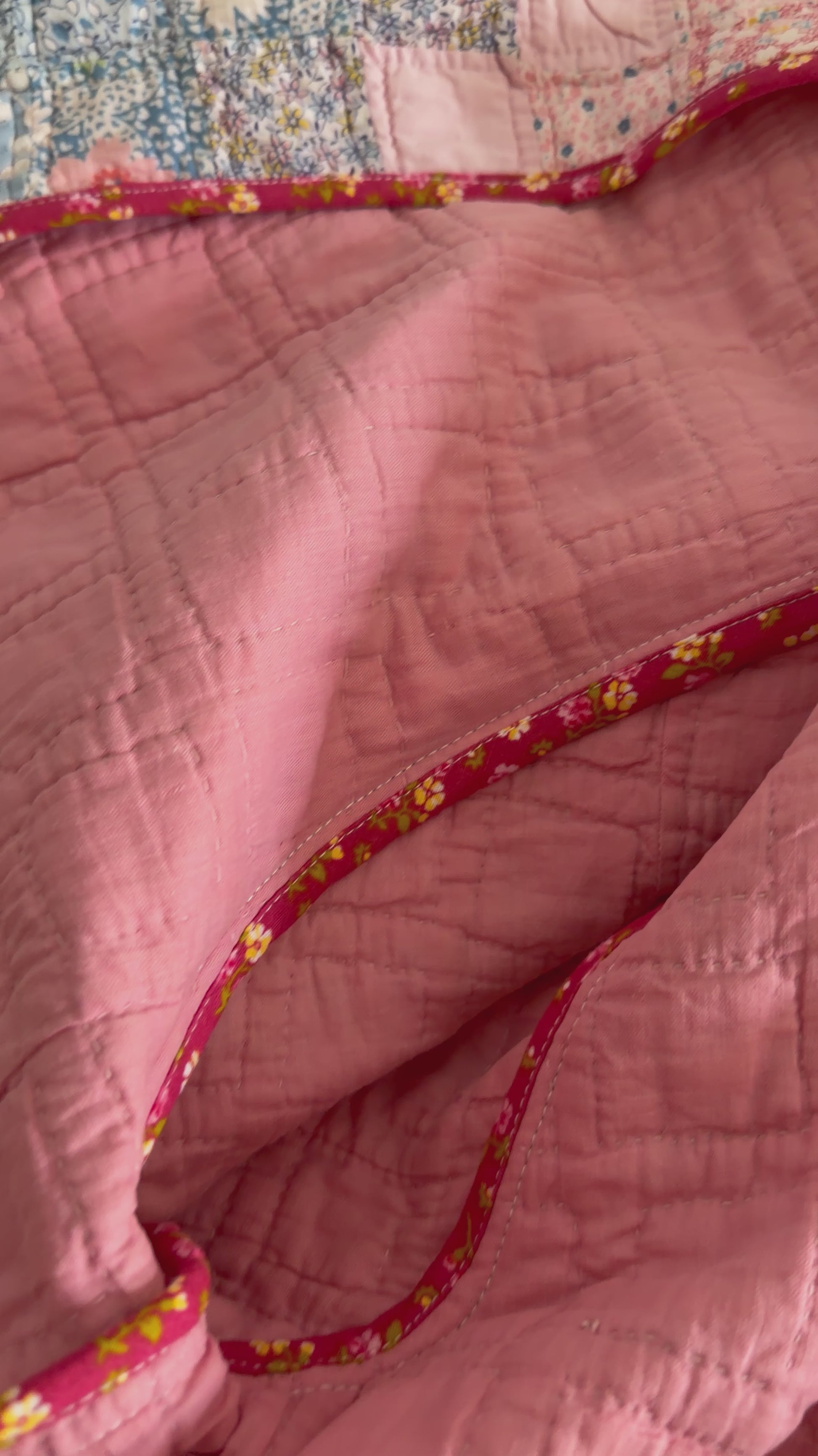 Upcycled from vintage 1940-70s hand-stitched cotton quilt in Postage Stamps pattern. Seams are bias bound for durability and longevity.