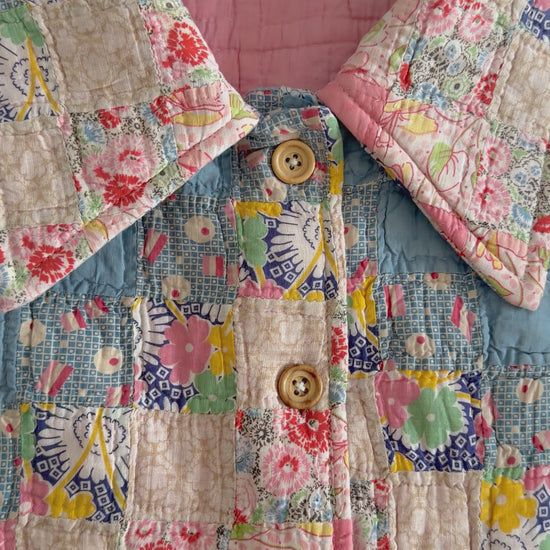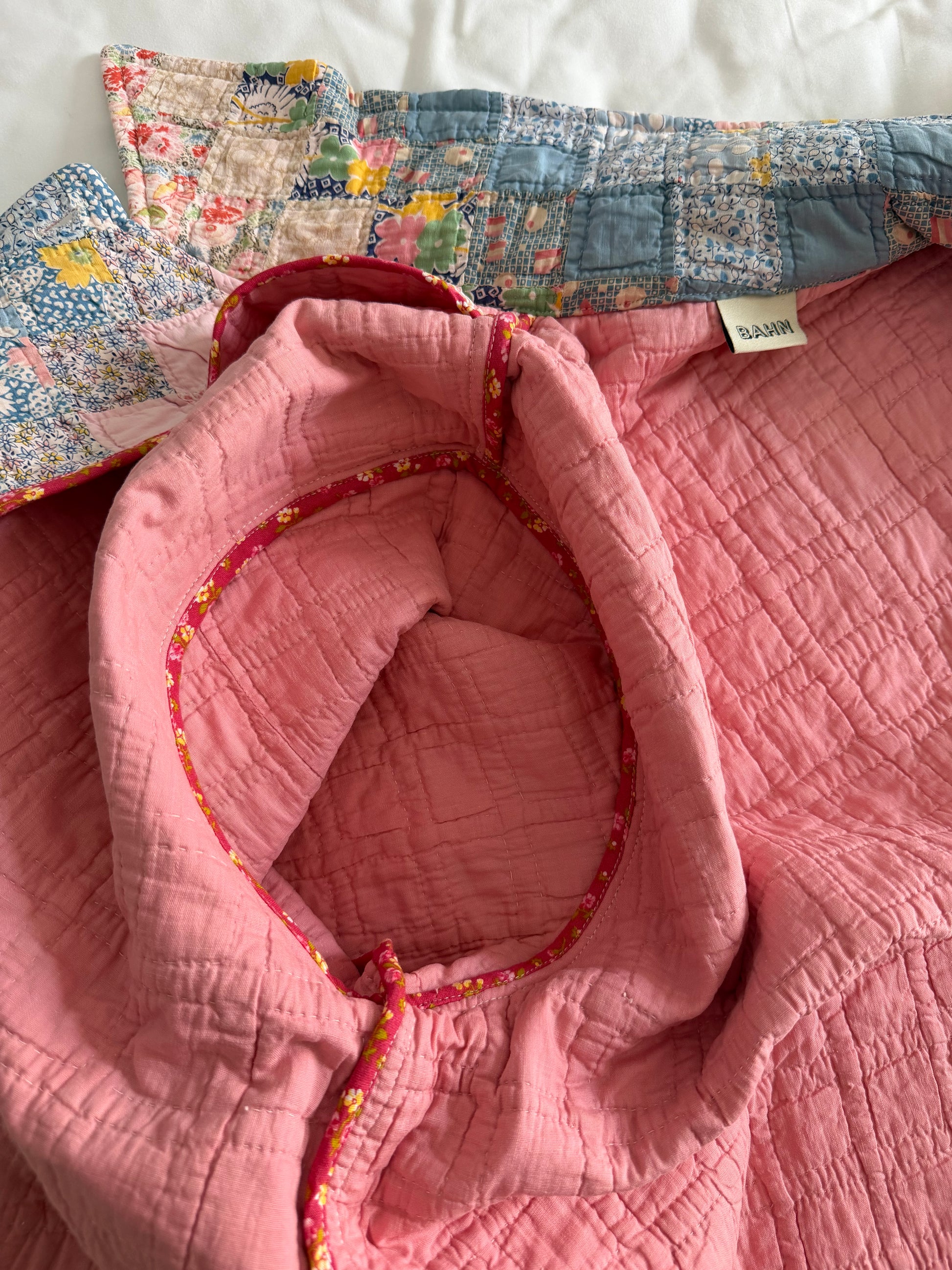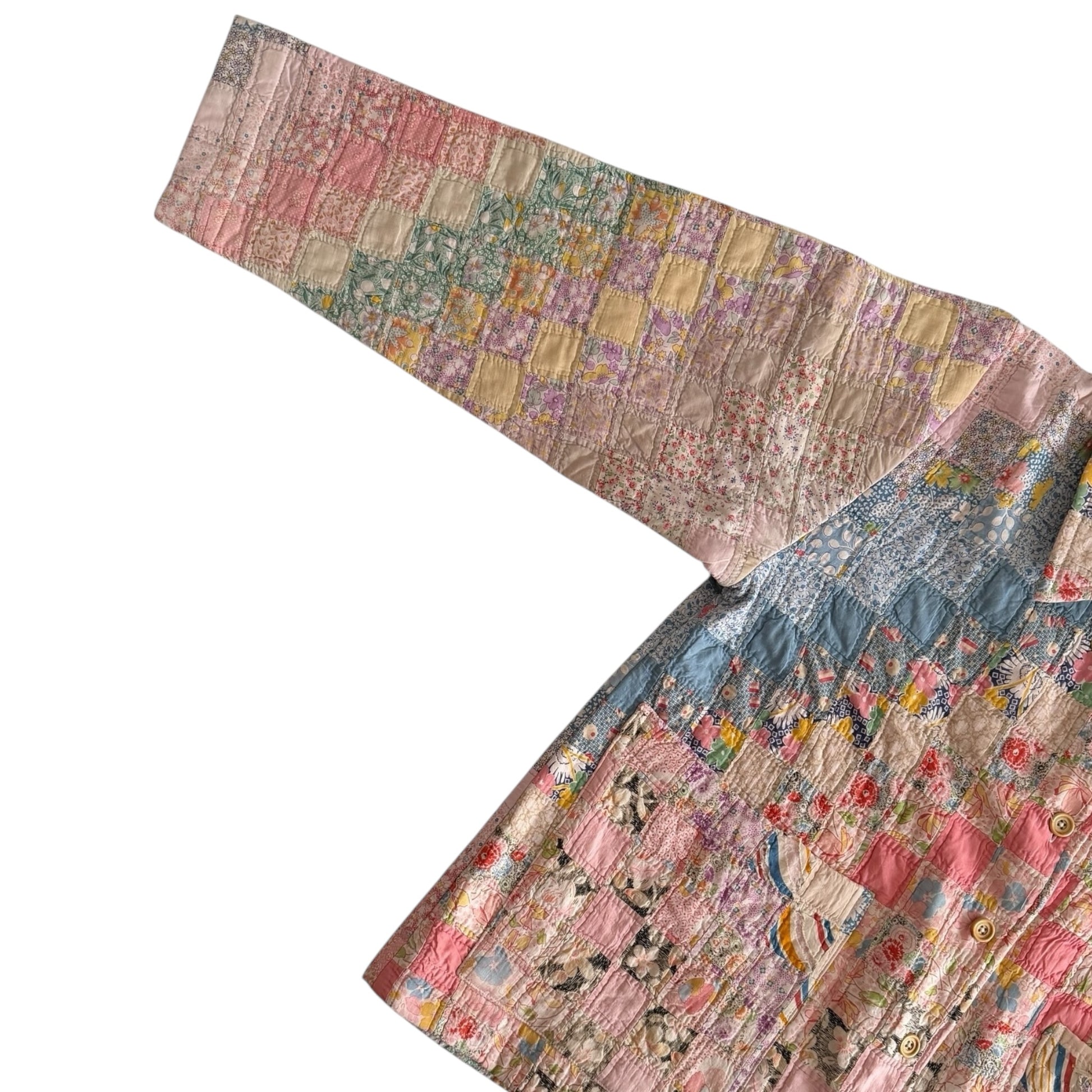 Upcycled from vintage 1940-70s hand-stitched cotton quilt in Postage Stamps pattern. Seams are bias bound for durability and longevity.