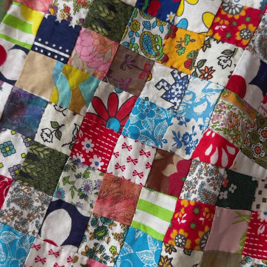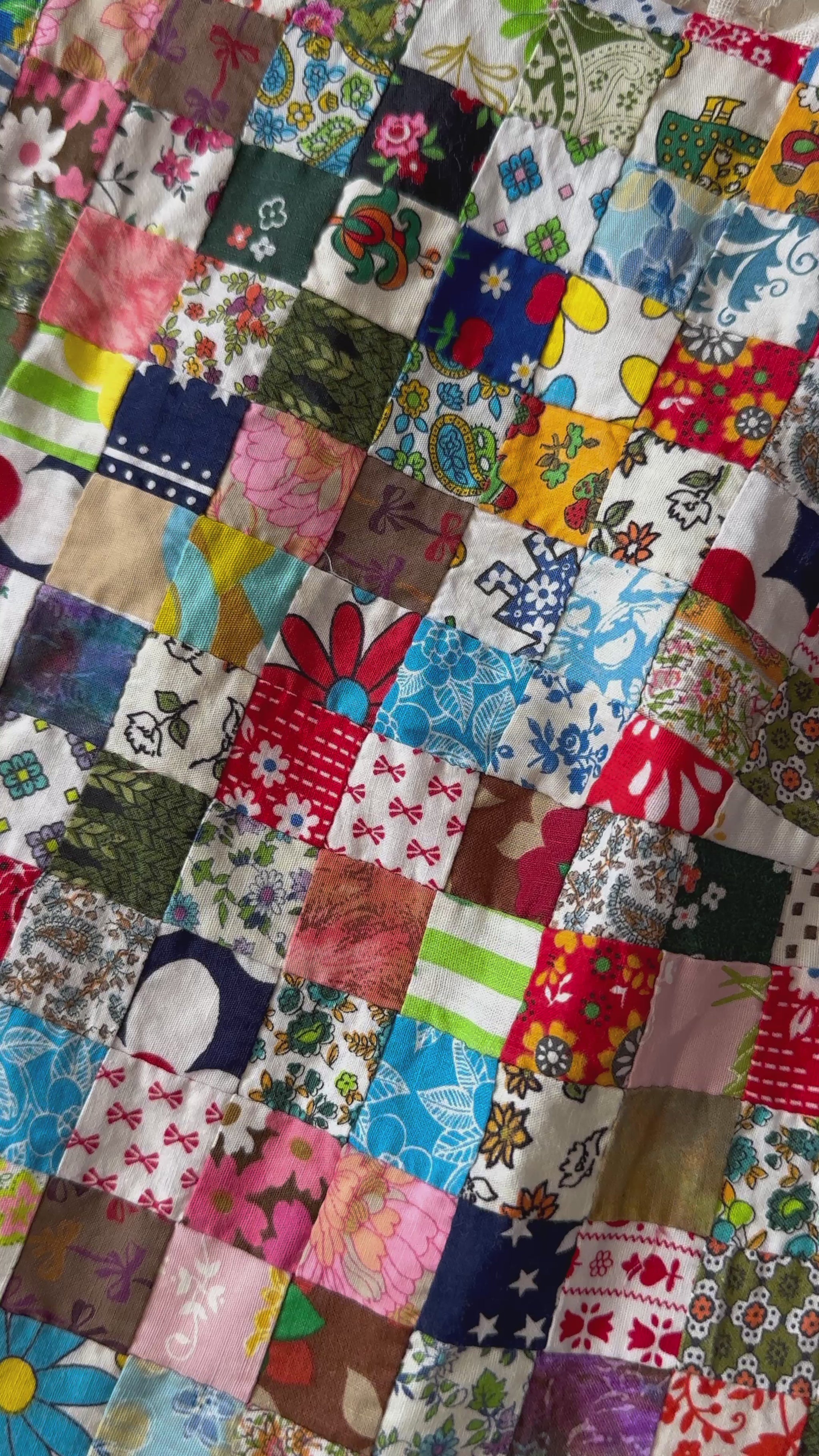 Front panel sewn from an unfinished vintage hand-stitched postage stamps quilt top and lined with muslin. Body is sewn with NOS textured cotton fabric. Deep side pockets. Seams are chain-stitched and serged. Finished with wood buttons.