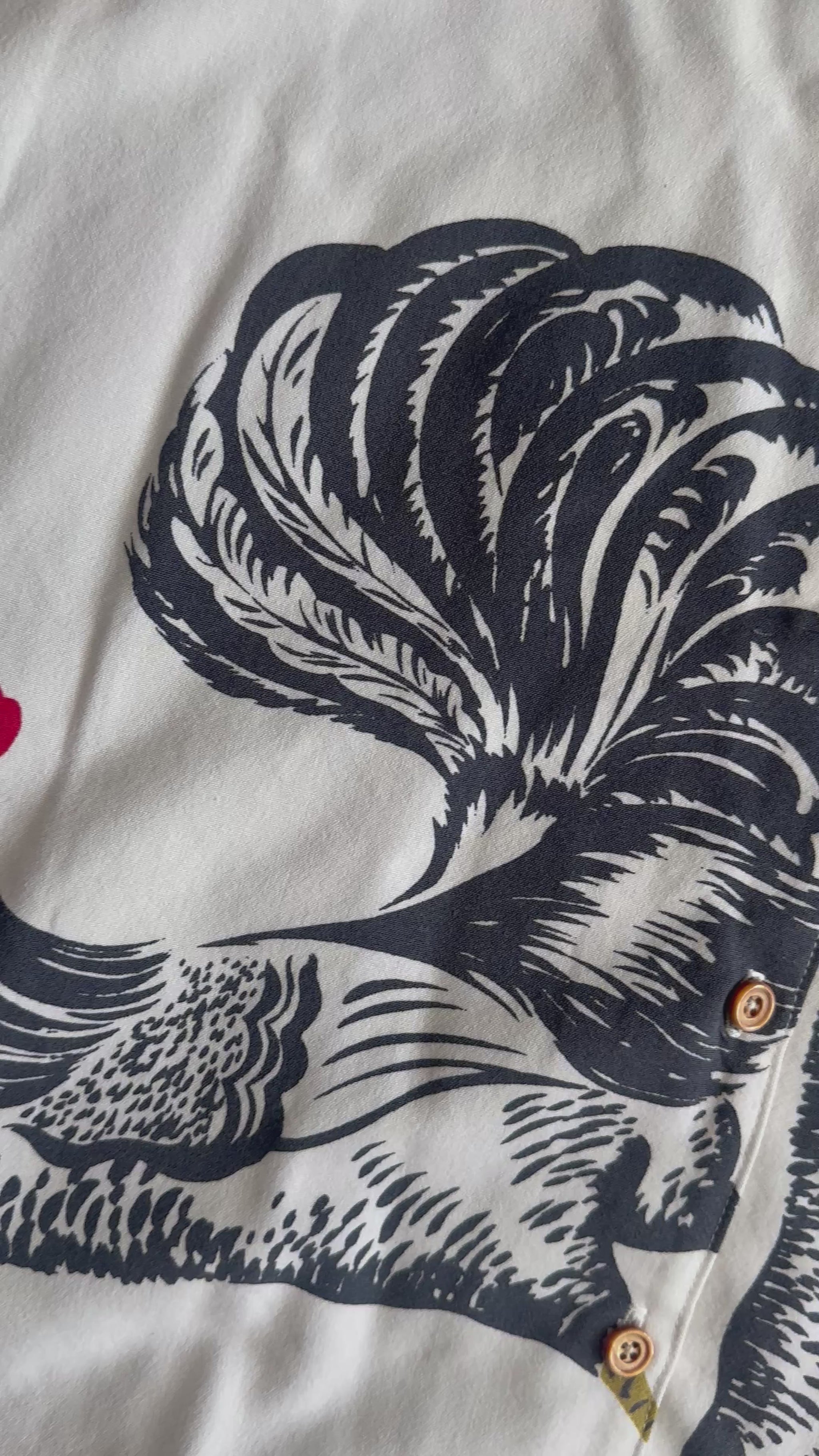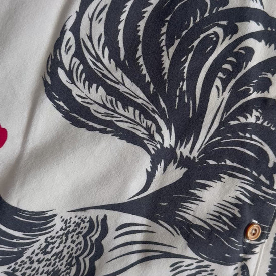 Upcycled from vintage tablecloth ft two roosters in cotton blend with back panels from Robert Kaufman linen/cotton blend fabric. Collar and button placket are interfaced. Seams are chain-stitched and serged. Finished with wood buttons.