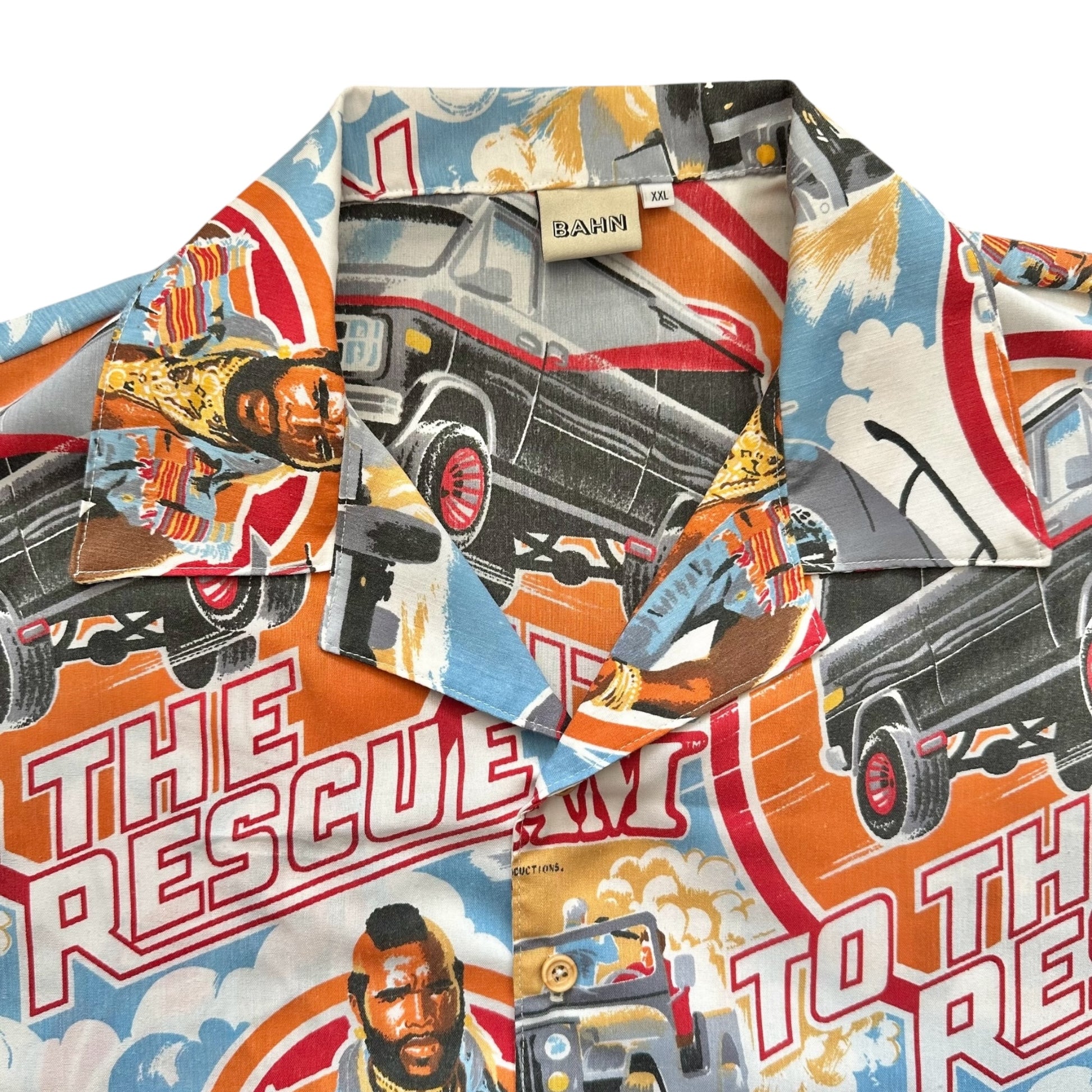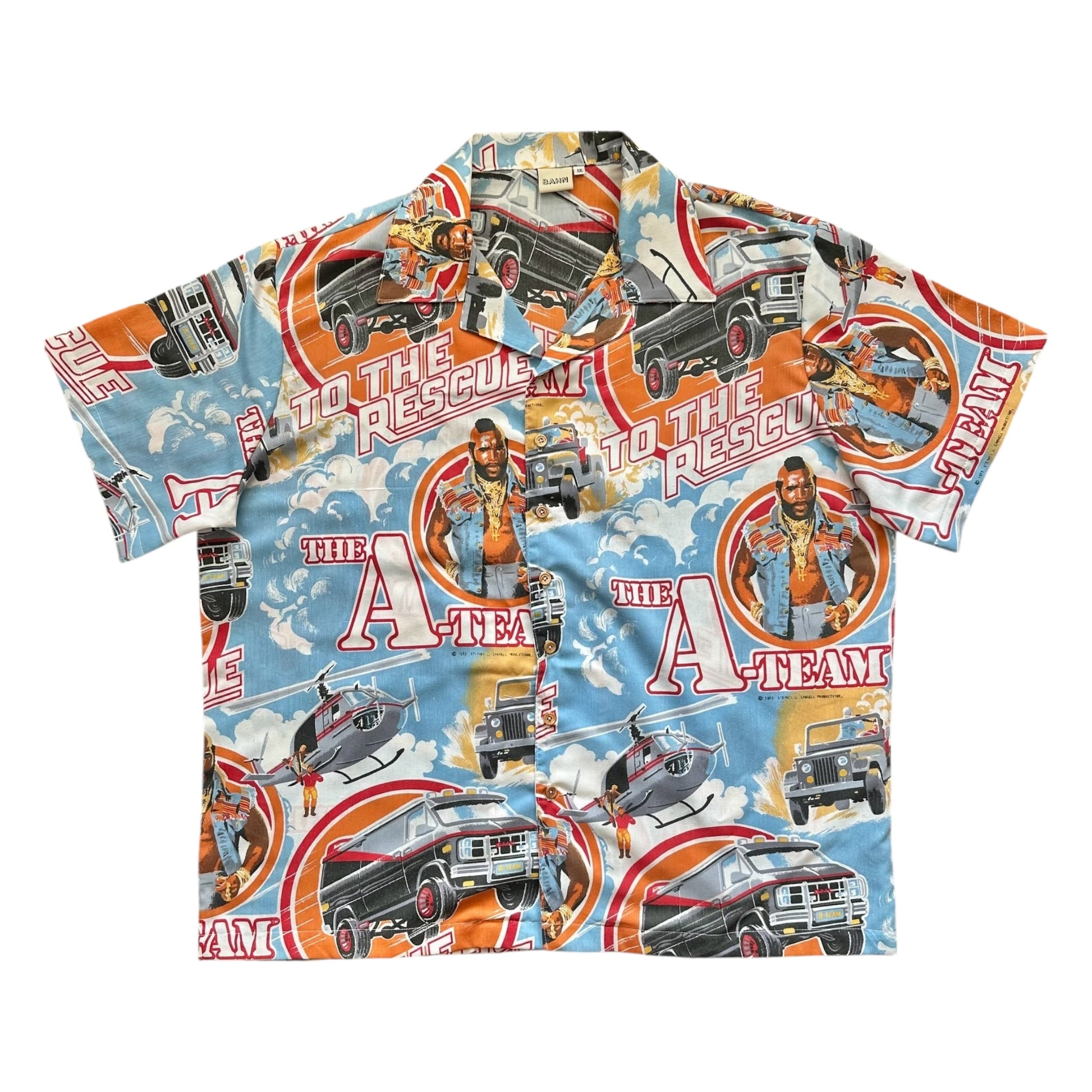This classic camp shirt silhouette is upcycled 1983 cotton/blend sheet featuring the beloved A-Team. Seams are chain stitched and serged.