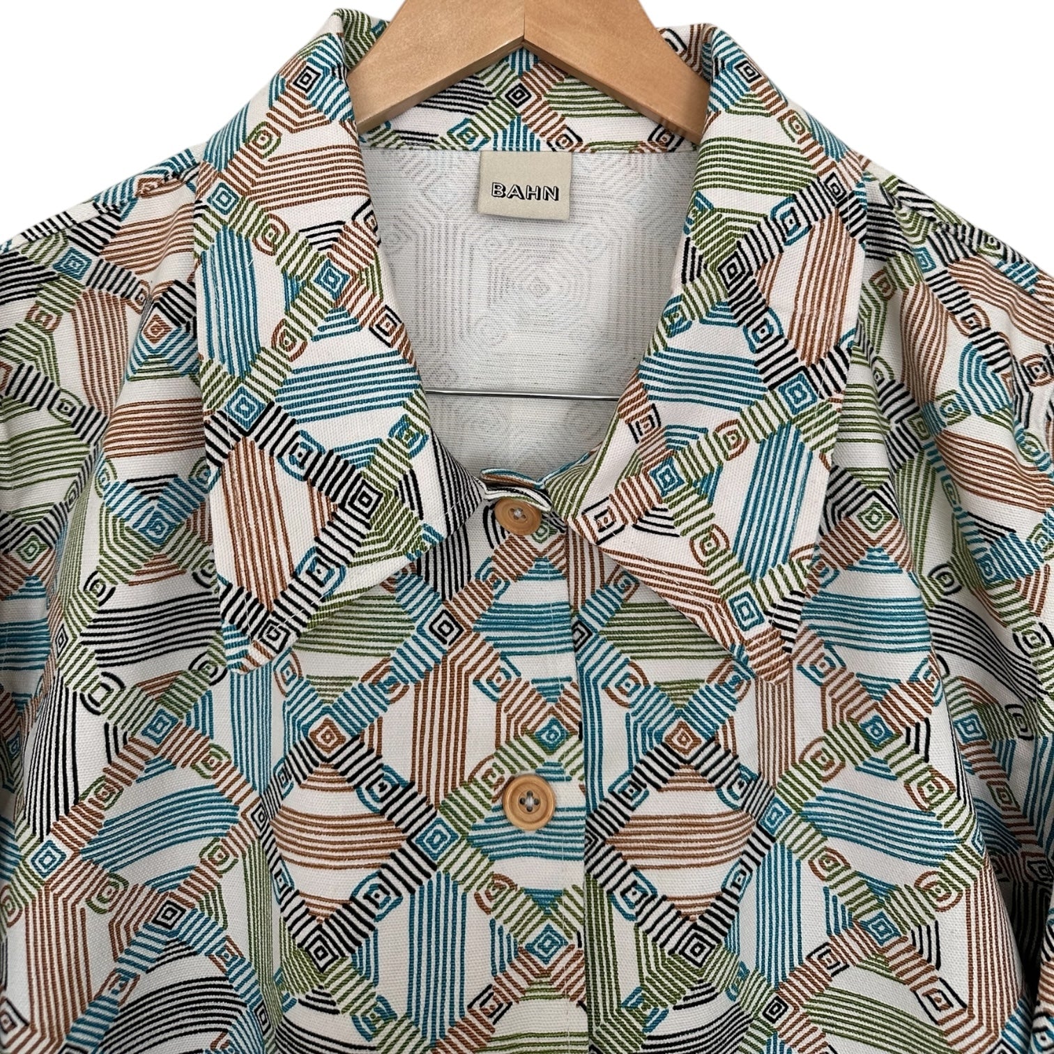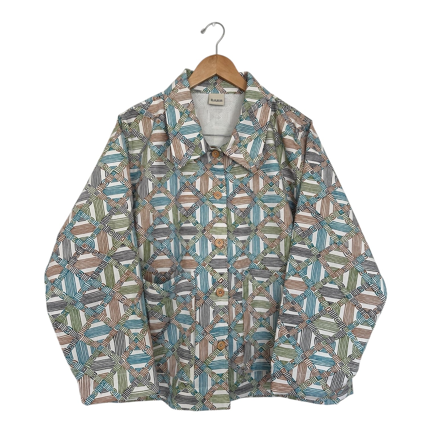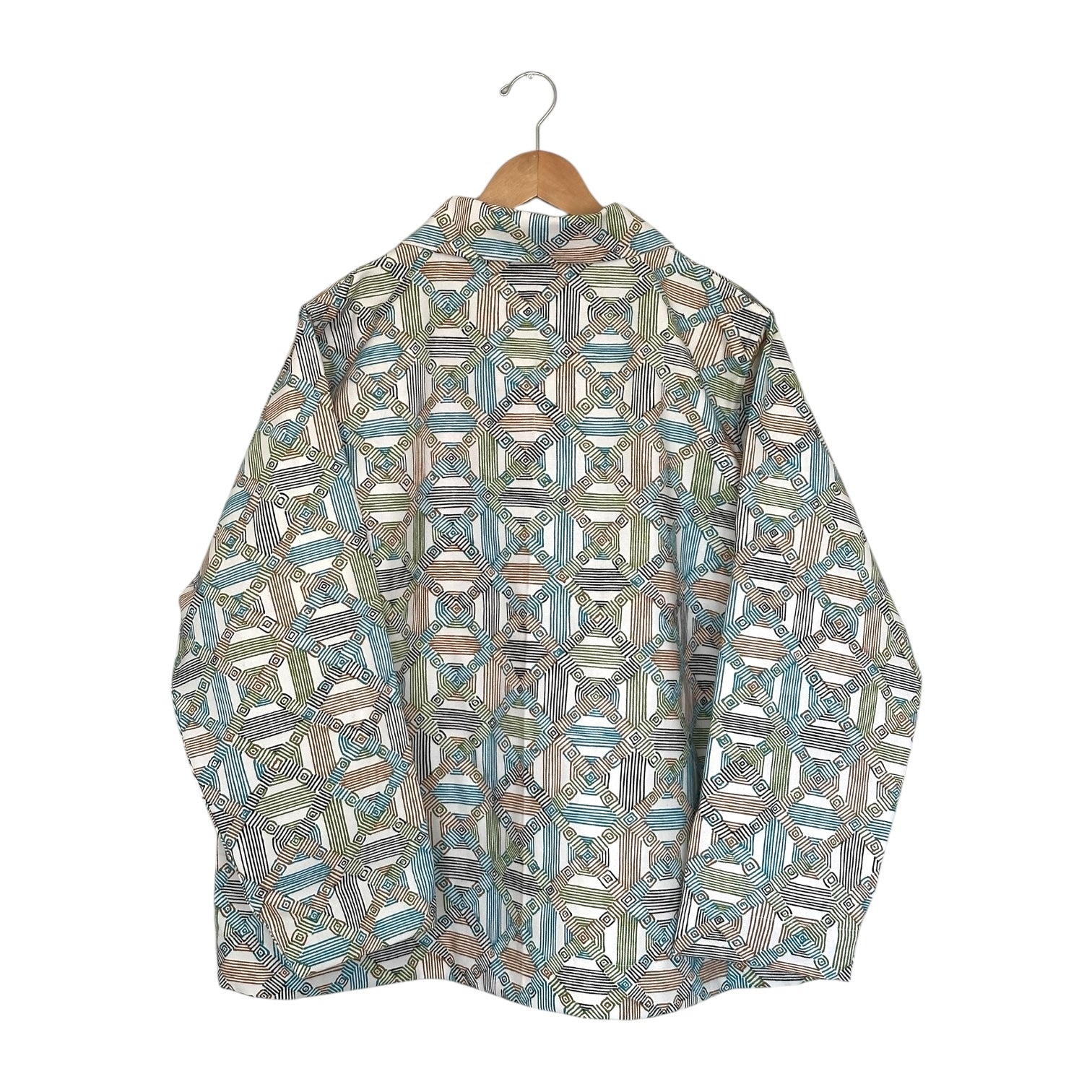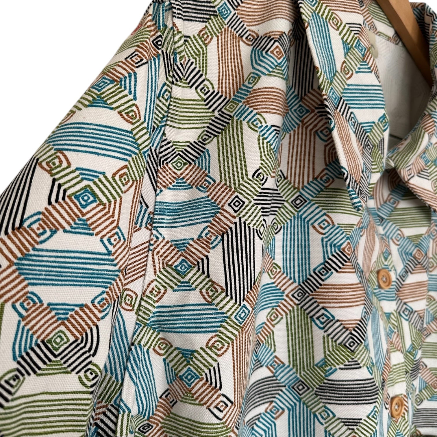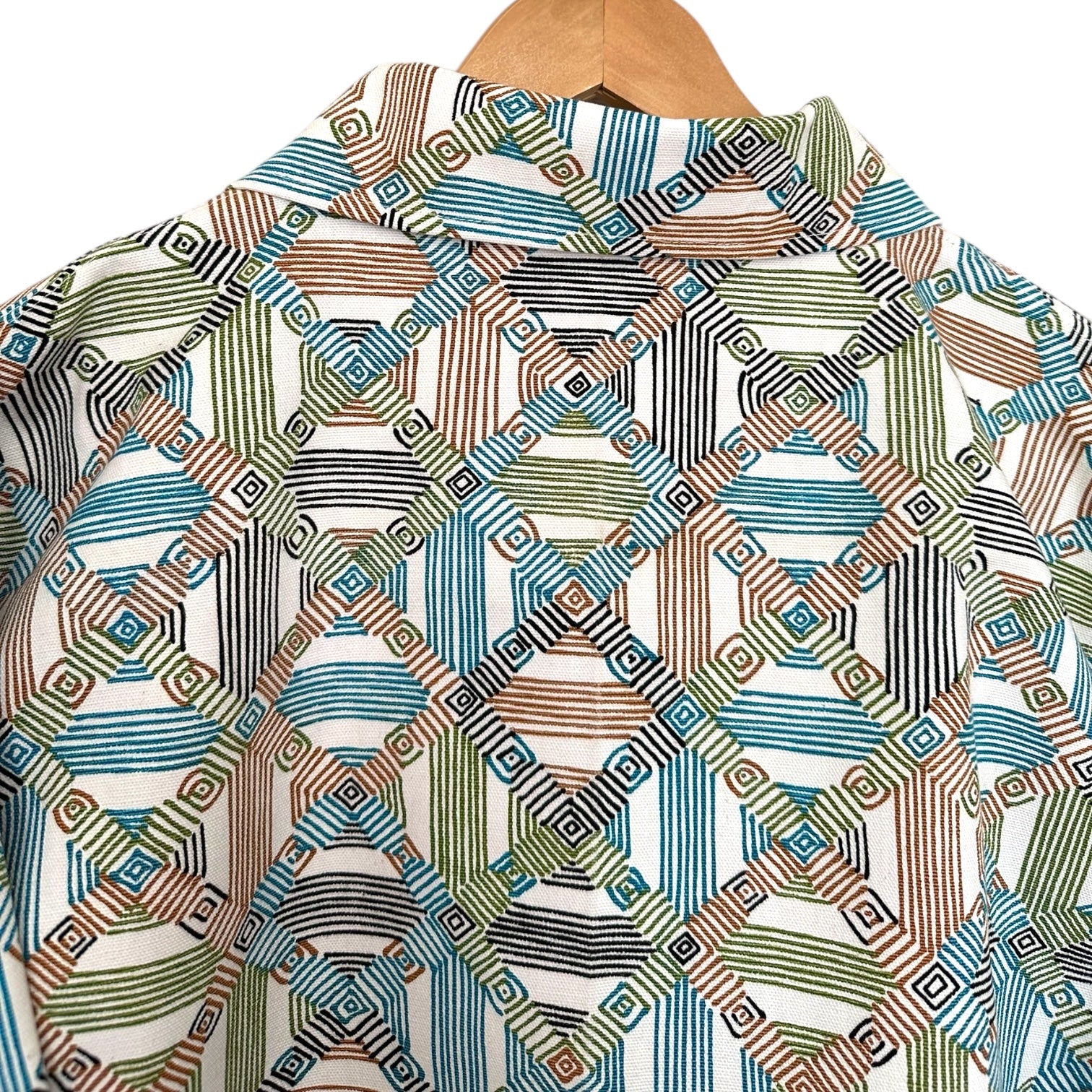 Sewn with NOS mid century geometric cotton canvas fabric. Seams are flat felled finished for durability and longevity.