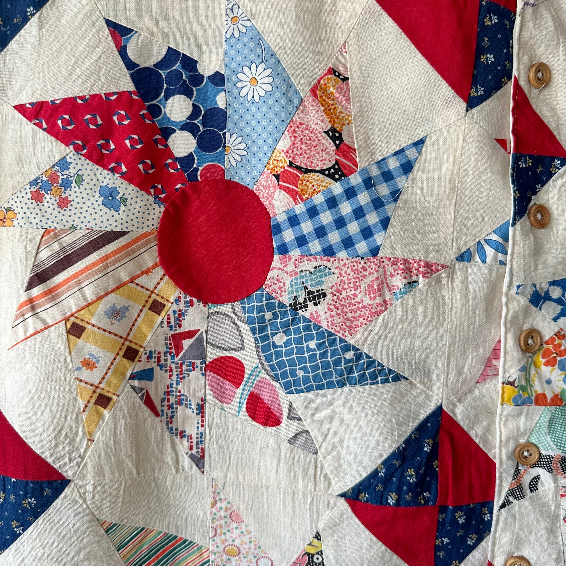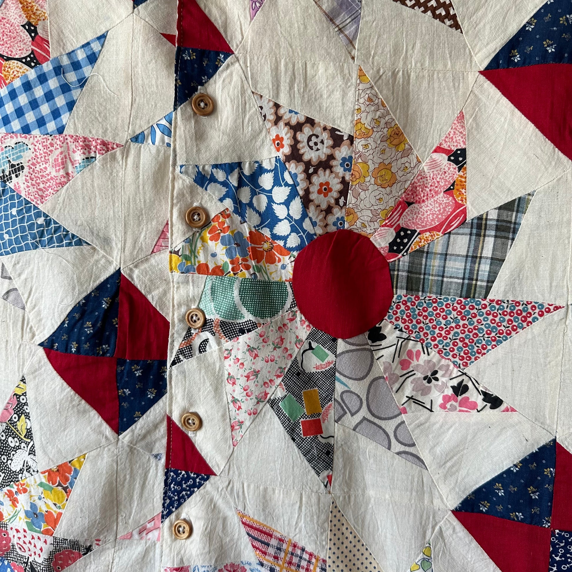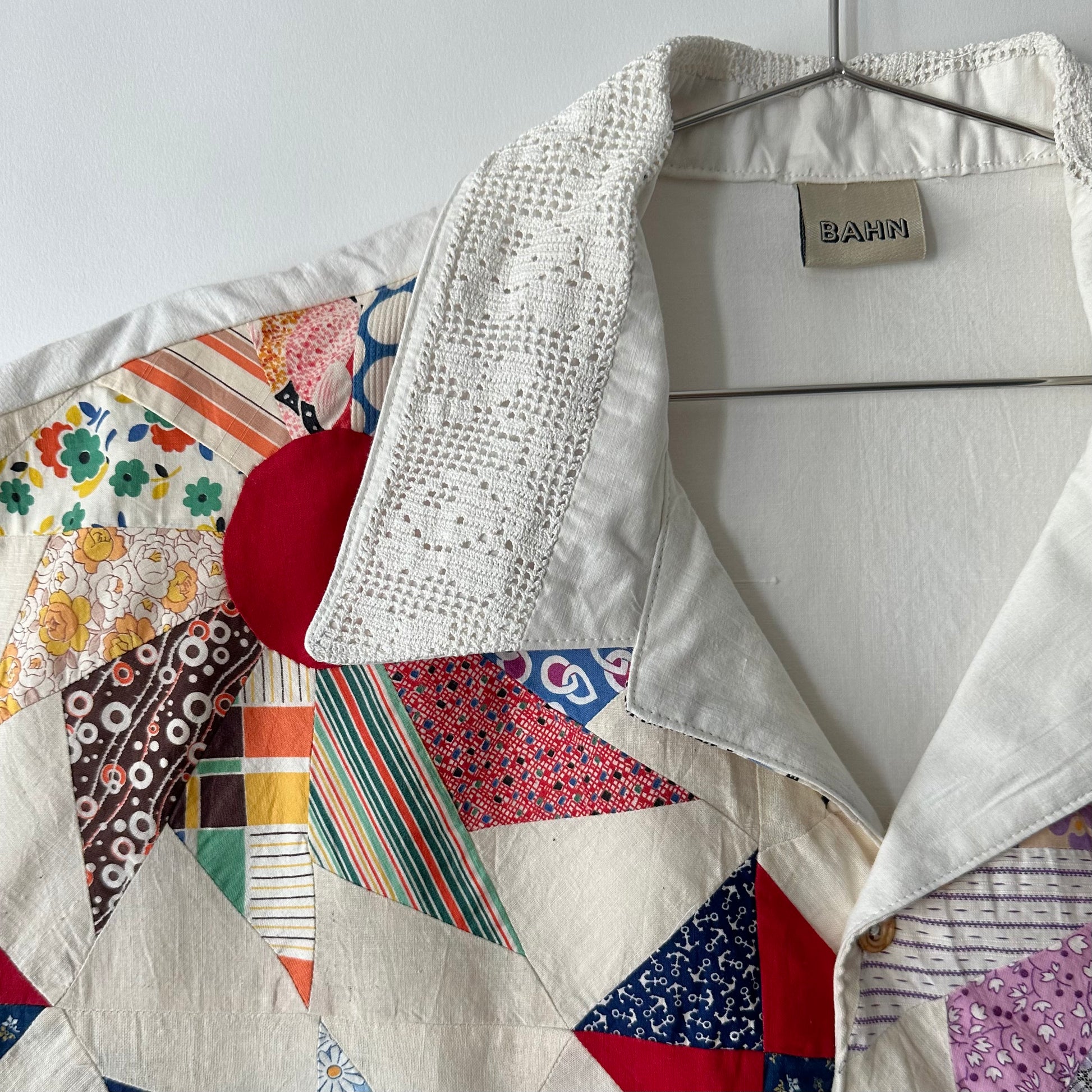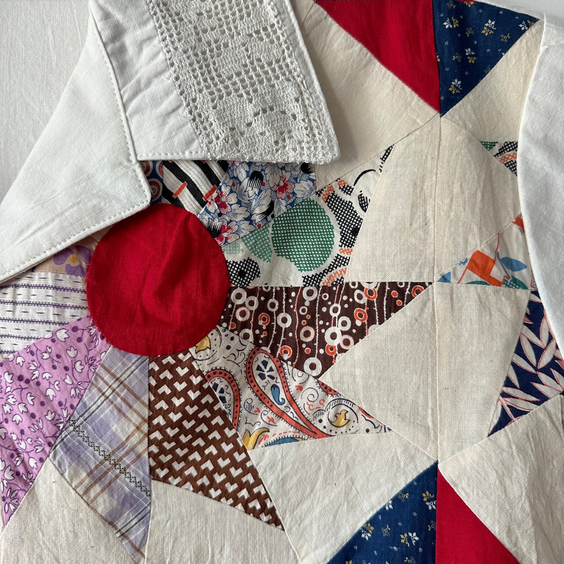 This classic camp shirt silhouette is sewn from a vintage Spinning Pinwheels quilt top in the front panels & lined with light weight linen. Back panel and sleeves are sewn from a tightly woven vintage cotton sheet. Top collar is a lace inset from the same vintage cotton sheet. Finished with wood buttons. Seams are chain stitched & serged.
