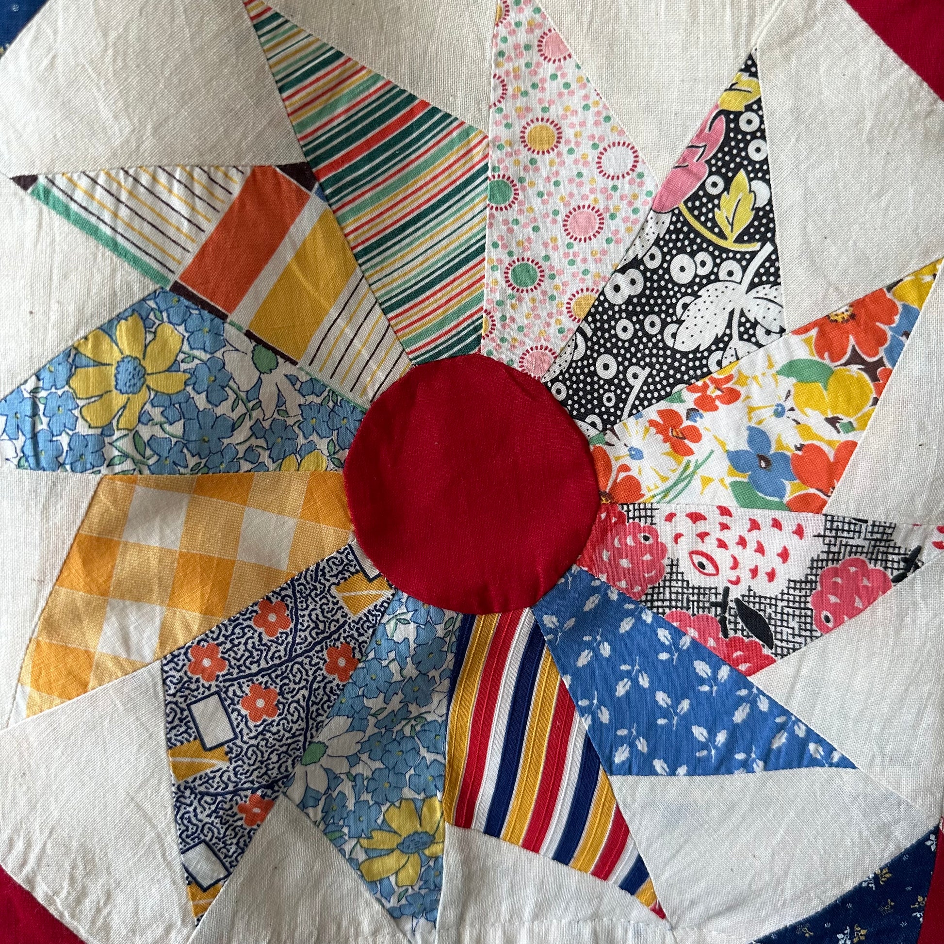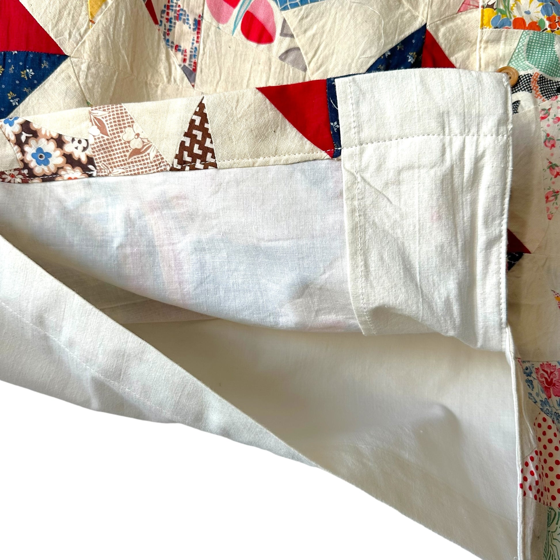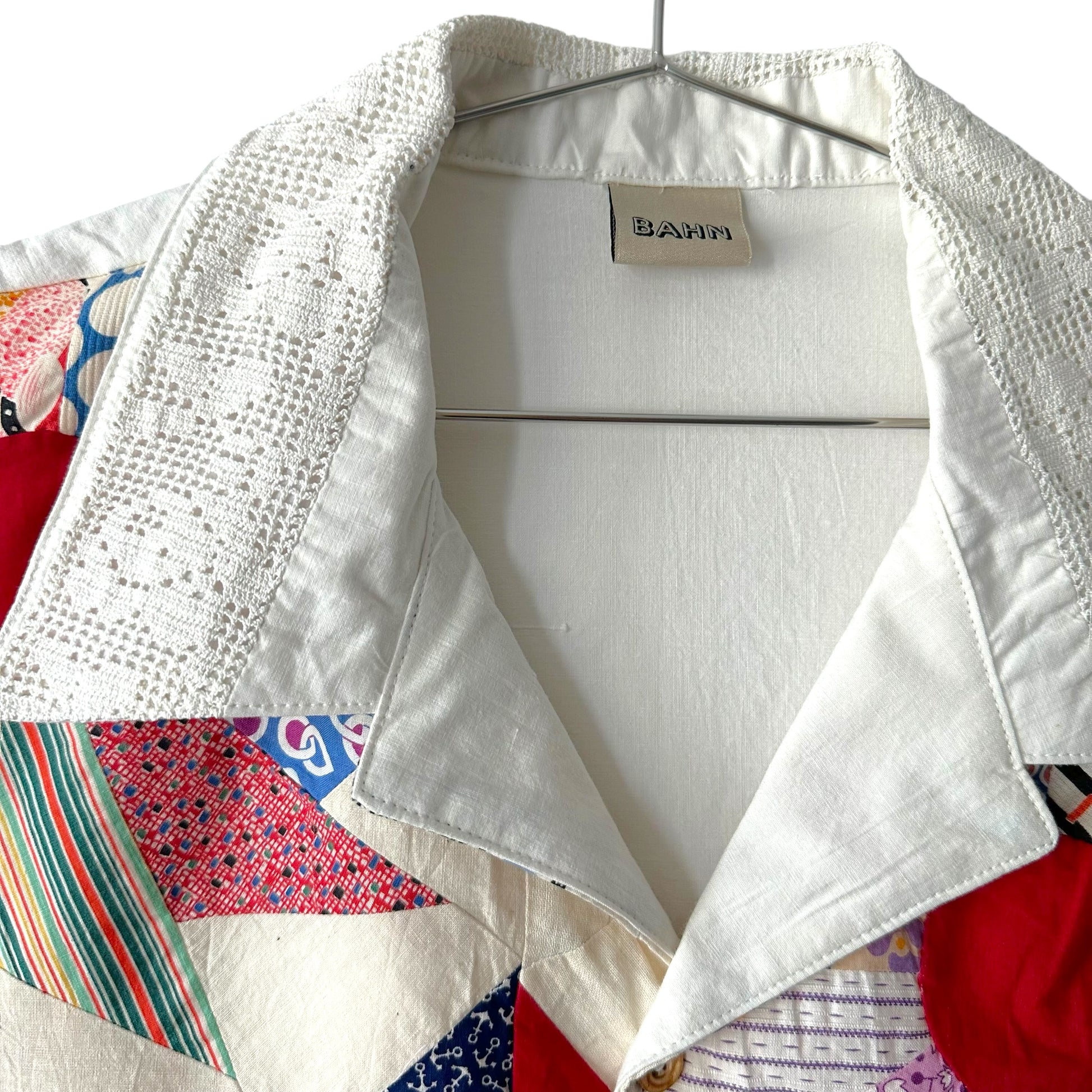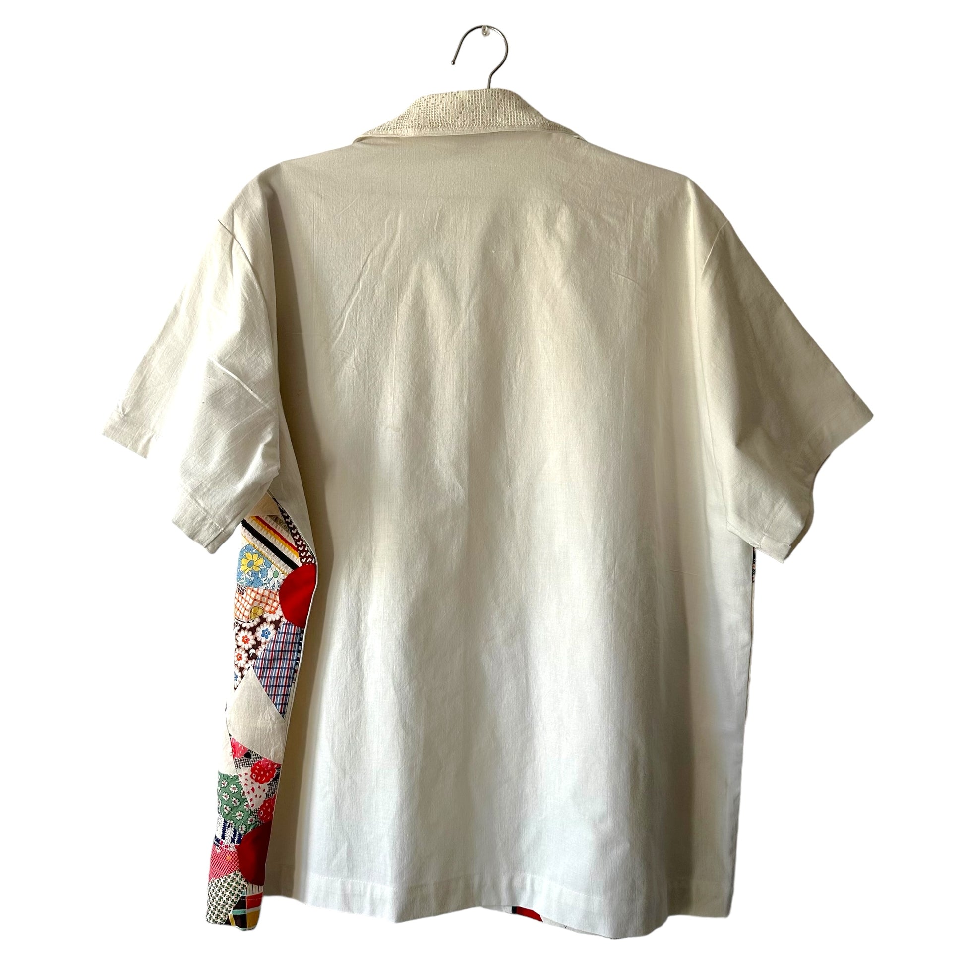This classic camp shirt silhouette is sewn from a vintage Spinning Pinwheels quilt top in the front panels & lined with light weight linen. Back panel and sleeves are sewn from a tightly woven vintage cotton sheet. Top collar is a lace inset from the same vintage cotton sheet. Finished with wood buttons. Seams are chain stitched & serged.